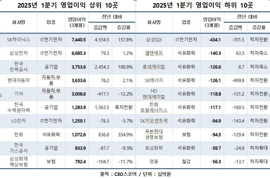 IT전기전자 업종, 영업익 4조6598억원 증가CEO스코어, 500대 기업 올해 1Q 실적 조사 박기호 기자 류진 한경협 회장 "저성장의 끝 보이지 않아…뉴 K-인더스트리 시대로"한·미·일 대표기업 성적표 비교하니…韓 성장·안정성, 美 수익성 높았다