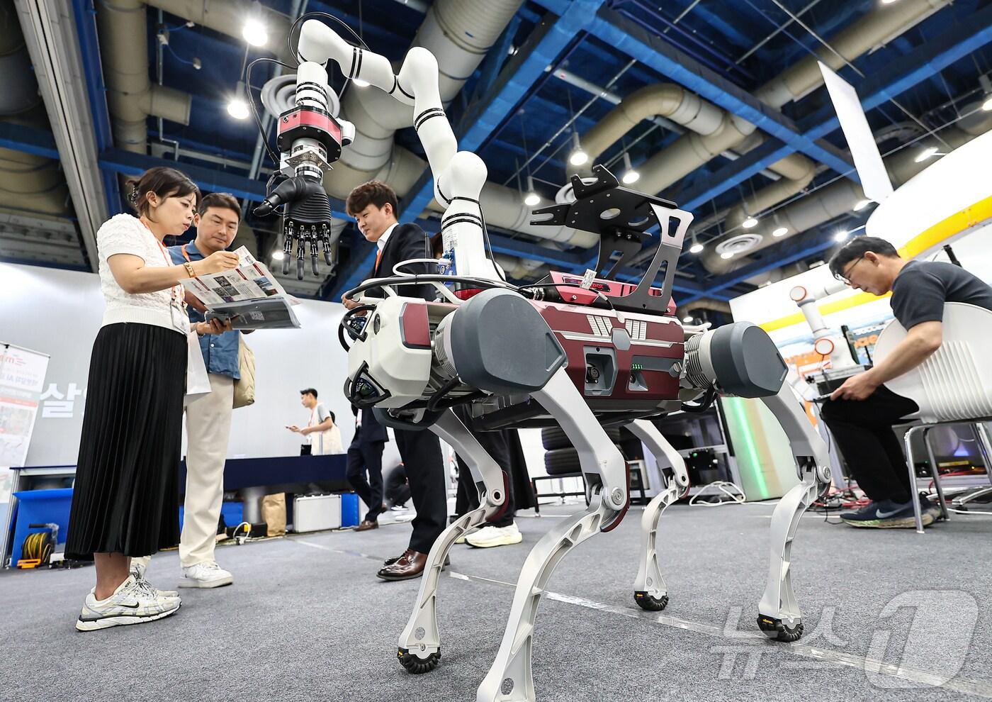 11일 서울 강남구 코엑스에서 열린 '2025 스마트테크 코리아'에서 관람객들이 사족 로봇을 살펴보고 있다. 올해로 14회째 맞는 이번 전시는 인공지능(AI)·빅데이터, 로보틱스, 디지털 유통·물류, 스마트 보안, 글로벌 공급망, 퀀텀(양자)기술 등 미래를 이끌 핵심 기술을 만나볼 수 있으며, 13일 까지 진행된다. 2025.6.11/뉴스1 ⓒ News1 김도우 기자