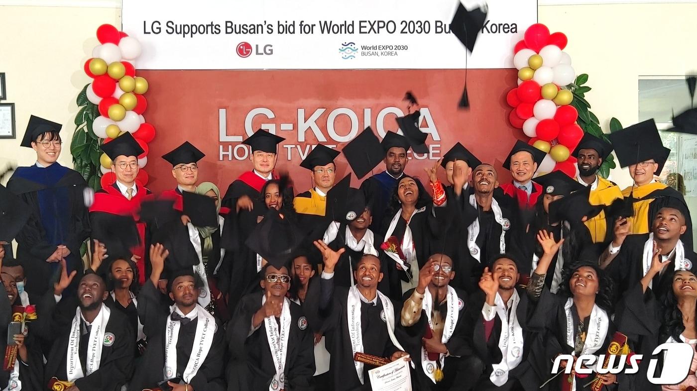 LG전자는 지난 26일(현지시간) 에티오피아 수도 아디스아바바에 있는 'LG-KOICA 희망직업훈련학교'의 제7회 졸업식을 가졌다고 28일 밝혔다. LG-KOICA 희망직업훈련학교는 6·25전쟁 참전에 대한 보은 차원에서 LG와 KOICA(한국국제협력단), 에티오피아 정부 등이 협력해 지난 2014년 개교했다. 졸업식에서 학생 등이 기념촬영을 하고 있다. (LG전자 제공) 2023.8.28/뉴스1 DB
