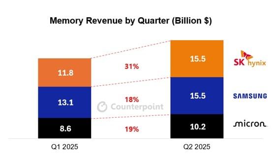 매출 15.5억달러 동률…1분기엔 삼성 1위, SK 2위 '고부가' HBM 판매 확대 효과…SK 1Q D램 첫 1위3대 메모리 기업의 분기별 메모리 매출(카운터포인트리서치 제공). ⓒ 뉴스1관련 키워드SK하이닉스삼성전자박주평 기자 LG, 성능·경제성 잡은 'K-엑사원' 공개····美·中 목표 모델 제쳤다"기업광고 맞아?" LG전자 'K판 입덕투어2', 매회 180만뷰 흥행관련 기사이상일 용인시장 "반도체 클러스터 지방이전론, 터무니없는 주장"범용 D램 고정거래가 사상 첫 9달러 신기록…낸드도 역대 두 번째 최고가'기관'이 올린 코스피, '개인'이 살린 코스닥…'게임 체인저'는 외국인상반기 코스피 살린 '조방원'…하반기 상승장 판 키운 '반도체 투톱'美, 삼성·SK 중국 반도체 공장 반입 규제 완화…연간 허가제 전환(종합)