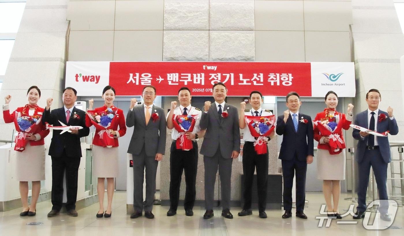 12일 인천국제공항에서 이상윤 티웨이항공 대표이사(왼쪽에서 여섯 번째), 신동익 인천국제공항공사 허브화전략처장(오른쪽에서 세 번째), 서동빈 티웨이항공 경영지원 총괄임원(왼쪽에서 네 번째), 황영조 티웨이항공 여객지원 담당임원(왼쪽에서 두 번째), 조병태 티웨이항공 인천지점장(오른쪽에서 첫 번째)이 티웨이항공의 인천~밴쿠버 노선 신규 취항식을 진행한 뒤 기념 사진을 촬영한 모습(티웨이항공 제공). 2025.07.12.