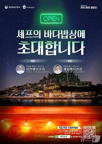 관광공사 추진 '바다 가는 달' 캠페인 연계 미식 행사조리명장 안유성·이모카세 김미령 셰프 참여셰프의 바다밥상 포스터(한국관광공사 제공)관련 키워드한국관광공사셰프바다밥상흑백요리사윤슬빈 관광전문기자 순록이 걷고 오로라가 깔렸네…화이트 크리스마스의 절정, 레비복합리조트법 없는 한국, 아시아 관광 경쟁서 밀린다관련 기사"5월은 바다가는 달"…숙박·해양관광 상품 모든 국민 할인해수부-문체부, 5월 '바다가는 달' 캠페인 진행…숙박·관광상품 할인