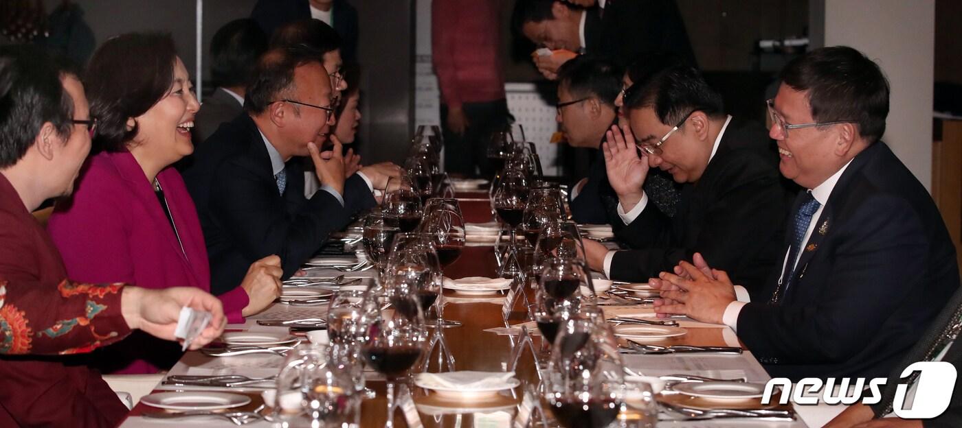 박영선 중소벤처기업부 장관이 25일 오전 부산 해운대구 씨네드 쉐프 센텀시티에서 열린 '아세안 환영오찬'에서 수빗 매씬쎄 태국 교육부 장관과 대화를 나누고 있다. 2019.11.25/뉴스1 ⓒ News1 여주연 기자