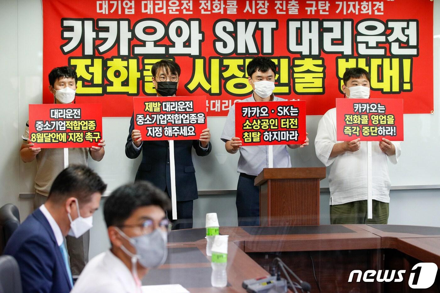 장유진 한국대리운전총연합회 회장이 5일 서울 영등포구 소상공인연합회에서 열린 '대기업의 대리운전 전화콜 시장 진입 반대 기자회견'에서 발언하고 있다. 대리운전연합회는 카카오와 SKT가 카카오톡, 티맵이라는 막강한 플랫폼을 이용해 시장을 점유해가고 있다며 대리운전 전화콜 시장의 중소기업적합업종 지정이 시급하다고 주장했다. 2021.8.5/뉴스1 ⓒ News1 안은나 기자