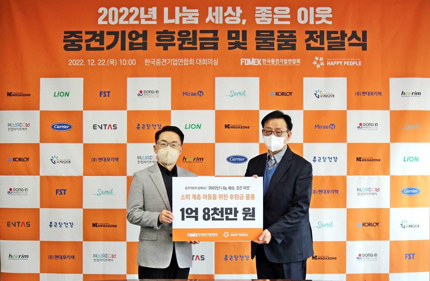 이호준 한국중견기업연합회 상근부회장(왼쪽)과 박희 해피피플 이사장이 기념사진을 찍고 있다.(한국중견기업연합회 제공)