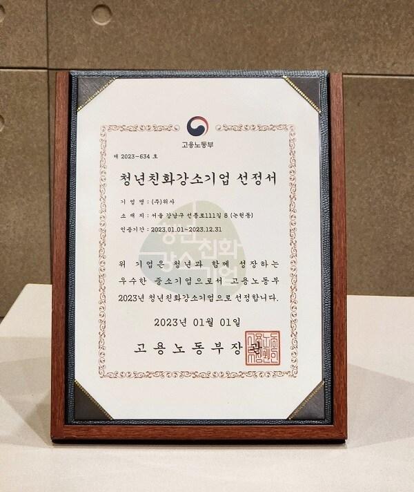 위사, 고용노동부 주관 2023년 '청년친화 강소기업' 선정