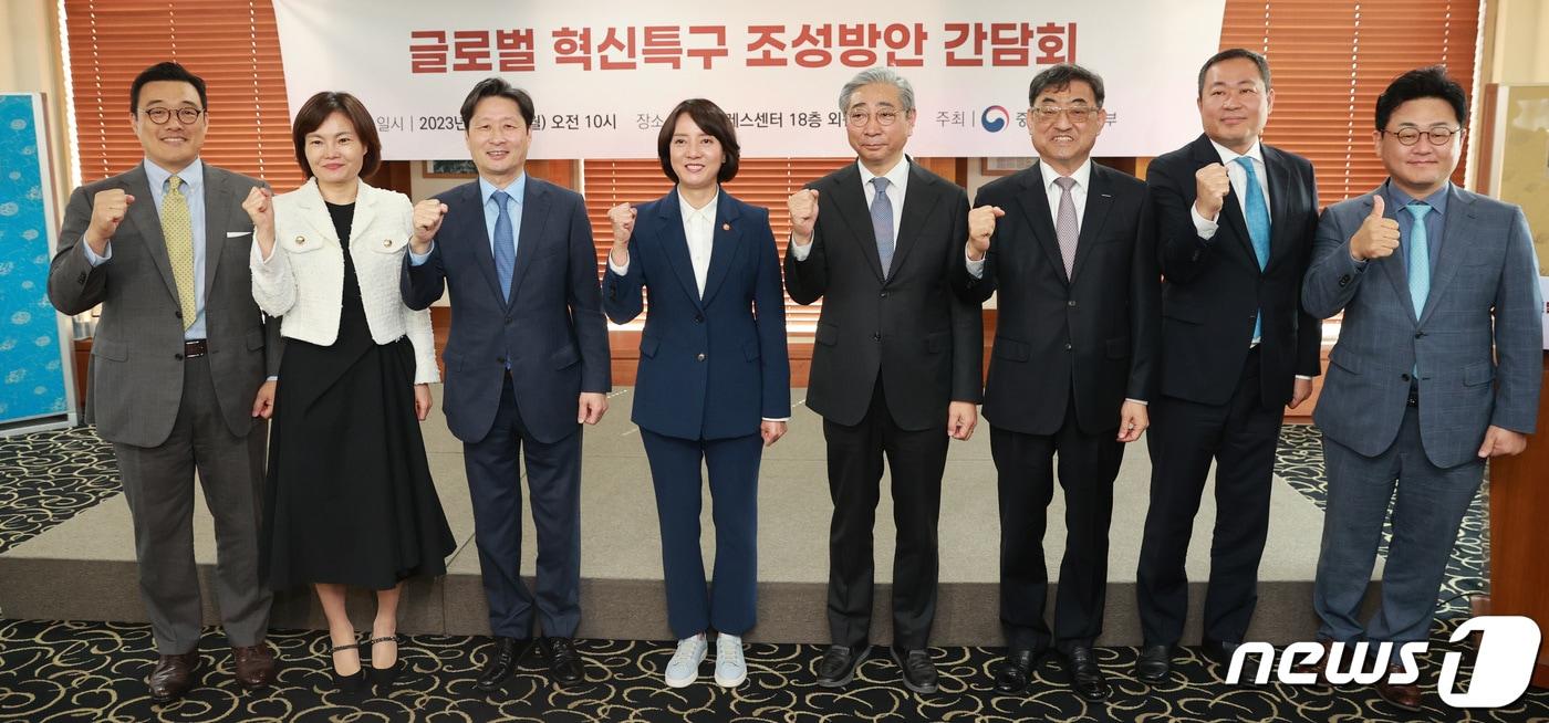 이영 중소벤처기업부 장관이 8일 서울 중구 한국프레스센터에서 열린 글로벌 혁신 특구 조성방안 간담회에서 기념 촬영하고 있다. 왼쪽부터 정륜 UL코리아 대표, 배경은 사노피 코리아 대표 겸 주한유럽상공회의소 헬스케어 위원장, 김후곤 변호사, 이 장관, 윤동섭 연세의료원장, 김무환 포스텍 총장, 성상엽 벤처기업협회장, 구태언 변호사. (중소벤처기업부 제공) 2023.5.8/뉴스1