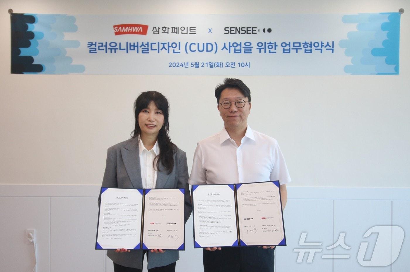 점자·촉각 특수 인쇄 전문기업과 색채계획 공동 수행이상희 삼화페인트 컬러디자인센터장과 서인식 센시 대표이사가 기념사진을 찍고 있다.(삼화페인트 제공)관련 키워드삼화페인트공업센시색약자컬러유니버설디자인CUD시각장애인김민석 기자 LG CNS·오픈AI 서비스파트너 체결…삼성SDS 재판매권한 단독유지앤트로픽 "韓 인구 대비 클로드 활용도 세계 상위권"