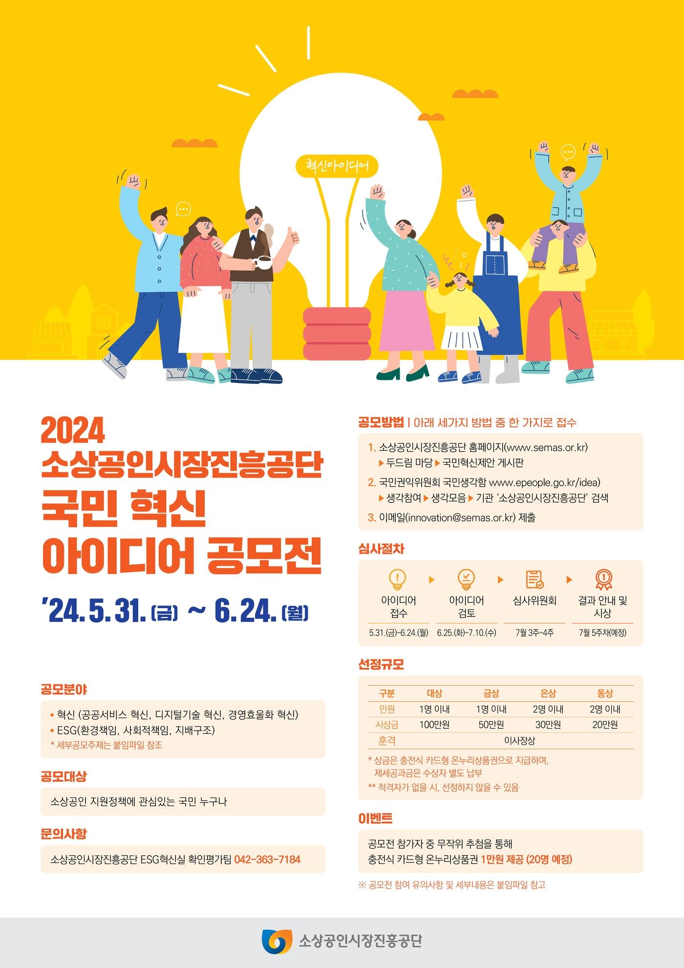 '혁신''ESG' 주제…6월 24일까지 온라인 접수소상공인시장진흥공단이 진행하는 '2024 국민 혁신아이디어 공모전'.(소상공인시장진흥공단 제공)관련 키워드소상공인시장진흥공단소진공소상공인전통시장공모전관련 기사소진공, 부패방지·규범준수 경영체계 국제표준 동시 인정소진공, 정책연구 성과공유회…중국 이커머스 대응책 논의소진공, 중기부 장관 표창 받아…"中企 규제 합리화 공로""함께 성장" 소진공, 17개 우수 프랜차이즈 선정"화재 조기 예방한다" 소진공, 부산지역 AI 출동시스템 시연회
