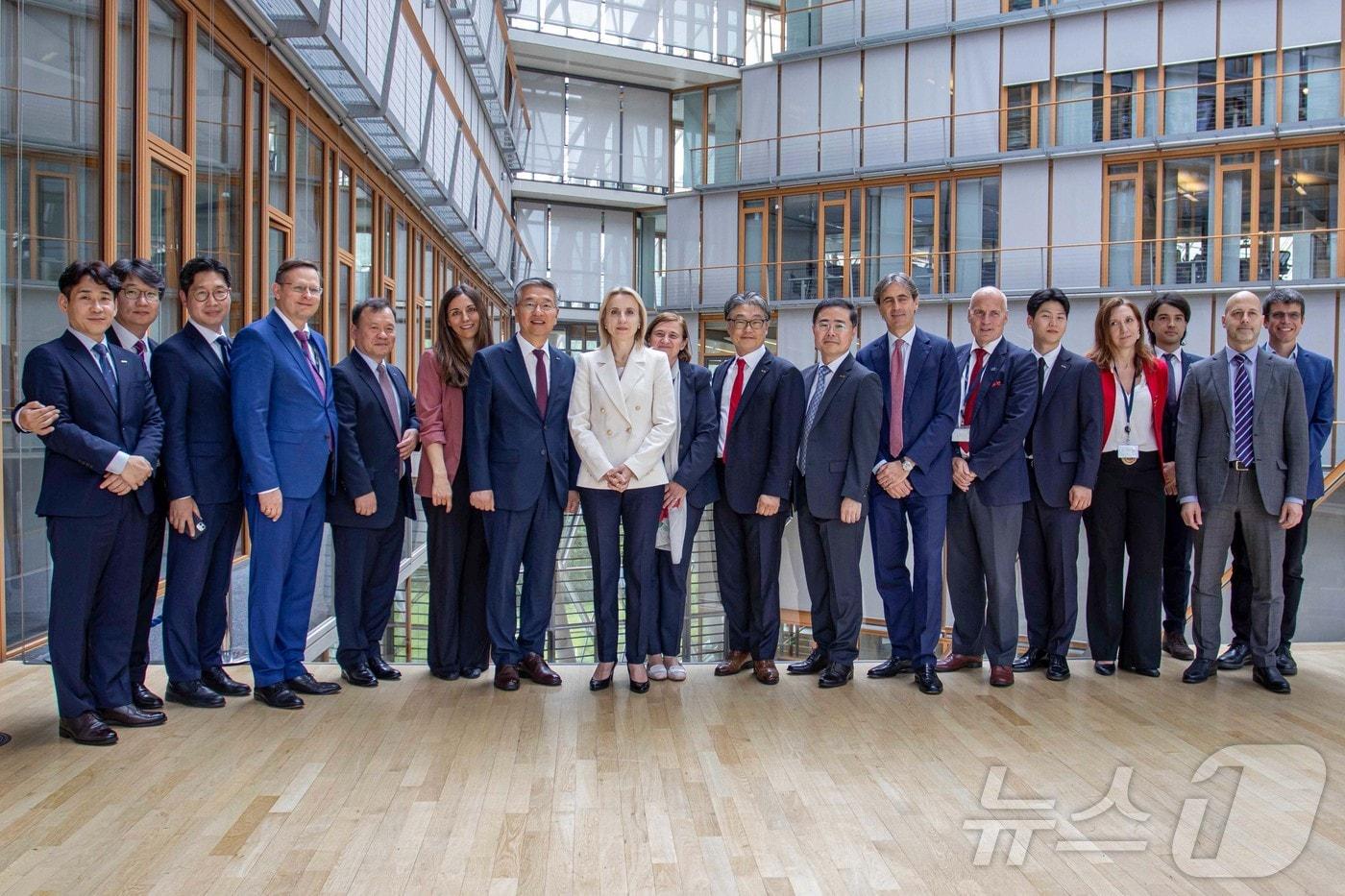 김종호 기술보증기금 이사장(왼쪽 7번째부터)과 테레사 체르빈스카 유럽투자은행 부총재 등 공동 워크숍 참석자들이 기념 촬영을 하고 있다.(기술보증기금 제공)