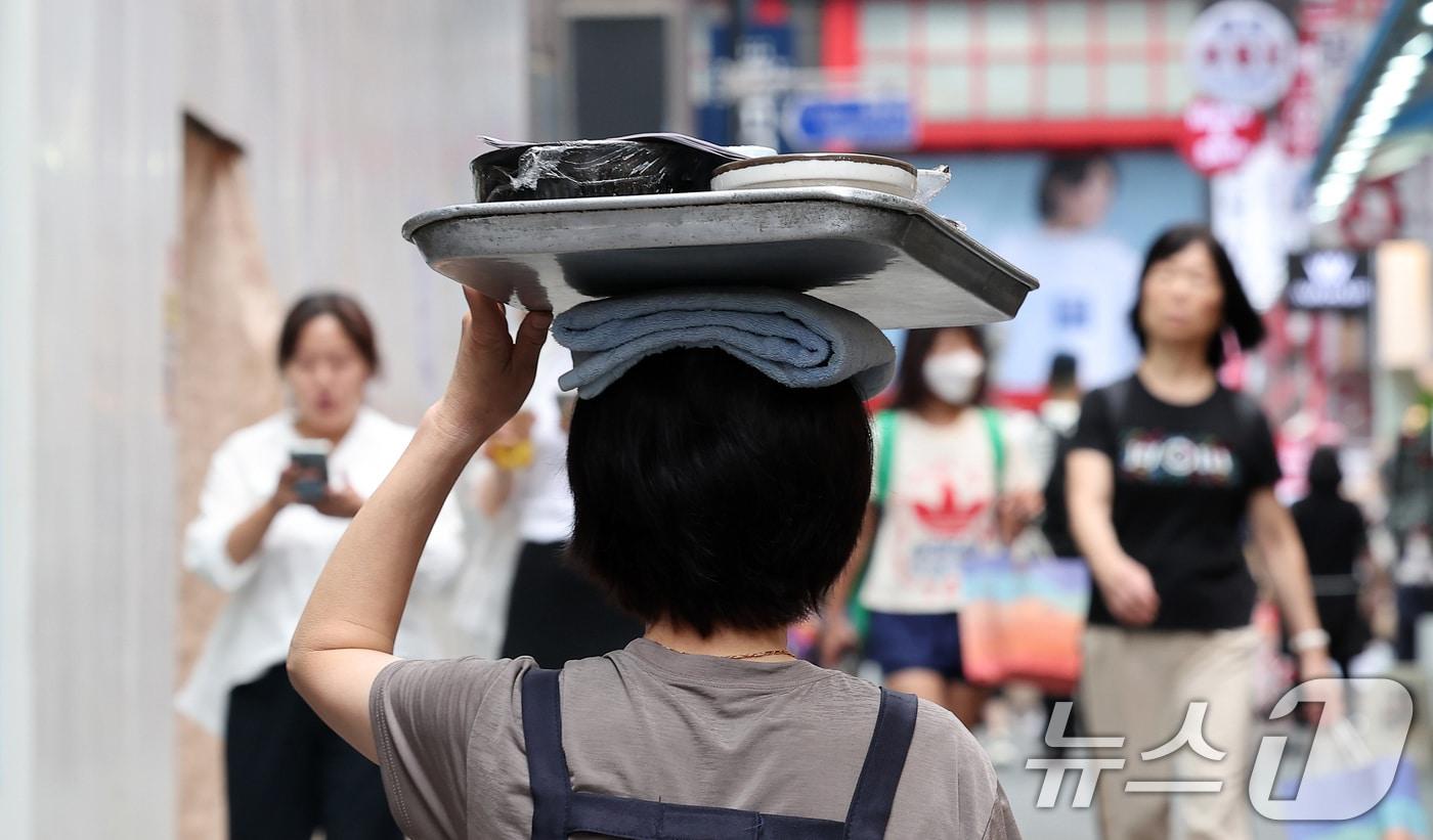 윤석열 대통령이 25조원 규모의 맞춤형 소상공인 종합대책을 발표했다. 발표한 대표적 지원책으로는 저금리 대환대출 지원 대상을 저신용자에서 중저신용자까지 확대하고, 최대 80만 명의 소상공인에게 정책자금과 보증부 대출 상환 기관 5년 연장이 주요 골자다. 사진은 3일 서울 중구 명동 거리에서 한 상인이 음식을 머리에 이고 이동하고 있다. /뉴스1 ⓒ News1 김성진 기자