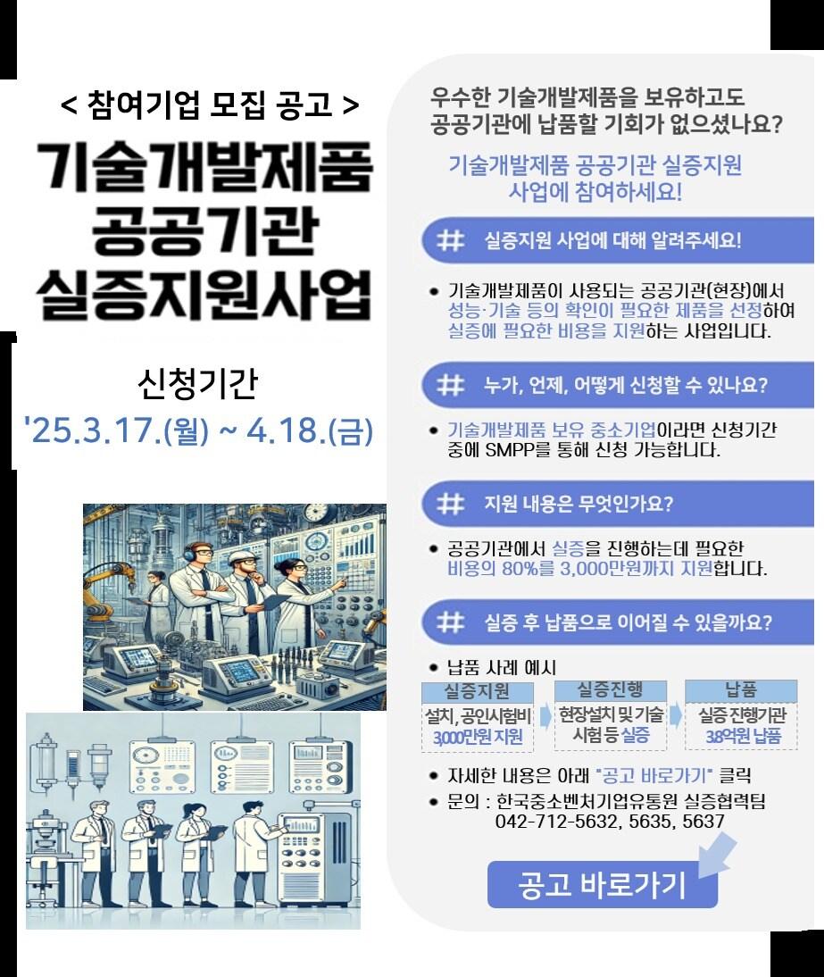 4월 18일까지 '기술개발제품 공공기관 실증지원 사업' 신청 받는다포스터 이미지 (한유원 제공)관련 키워드중소기업매칭실증한유원한국중소벤처기업유통원공공기관실증지원사업이민주 기자 티오더, 현장 지원 체계 강화…"주말·심야에도 상담 가능"'중기 AI 전환' 내건 중진공, 'AX혁신실' 콘트롤타워 세웠다관련 기사한국중소벤처기업유통원, 2025 공공구매제품 구매상담회 개최