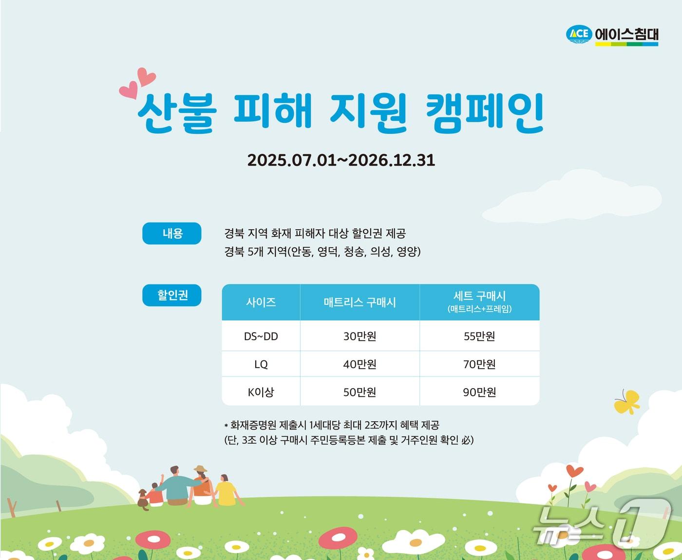 내년 말까지 제품 구매 시 할인… 대구·경북 11개 지점 동참산불 피해 지원 캠페인 이미지 (에이스침대 제공. 재판매 및 DB금지)관련 키워드에이스침대산불회원사소식장시온 기자 "'한샘다움'으로 기업문화 재정립…투명경영 실천"중소기업계 "해외진출촉진법 발의 환영…행정 비효율 줄일 것"