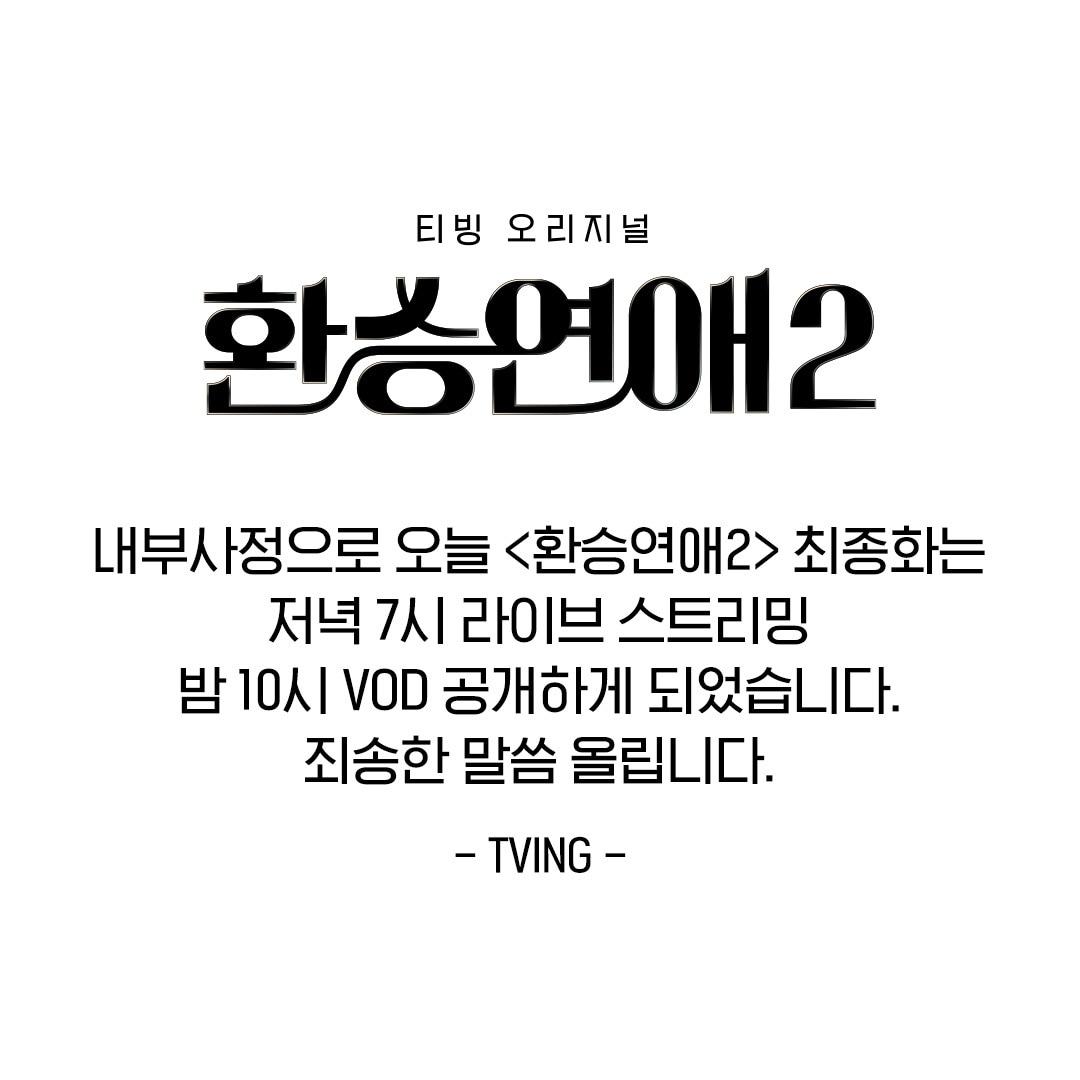 최종화 공개 1시간 반 전에 연기 공지, 이용자 불만 쏟아져영화관 단체관람 이벤트는 예정대로…형평성 문제 제기도티빙은 28일 '환승연애2' 최종화 공개가 평소보다 3시간 늦은 이날 오후 7시로 연기됐다고 밝혔다. (티빙 페이스북 갈무리)'환승연애2' 최종화 단체관람 이벤트가 진행되고 있는 연남CGV 모습. 스포일러 금지 동의서를 작성 후 티켓을 수령하도록 안내하고 있다. (독자 제보)관련 키워드환승연애환승연애2티빙OTT이기범 기자 '국대AI' 선발 연일 구설수…과기부 '침묵'에 혼란 가중새해에도 '개점휴업' 방미통위, 국회에 위원회 구성 촉구관련 기사제대로 터진 임짱…임성근 셰프, TV-OTT 비드라마 출연자 화제성 1위'프로젝트Y', 전종서·한소희 동시 출격…멜로보다 센 도파민 '케미' [N초점]'흑백요리사2' 비드라마 화제성 2주 연속 정상…손종원은 출연자 1위'흑백요리사2' 화제성 올킬…시즌1보다 높다'환승연애4' PD, 특정 출연자 밀어주기? "전혀 없어" [N인터뷰]①