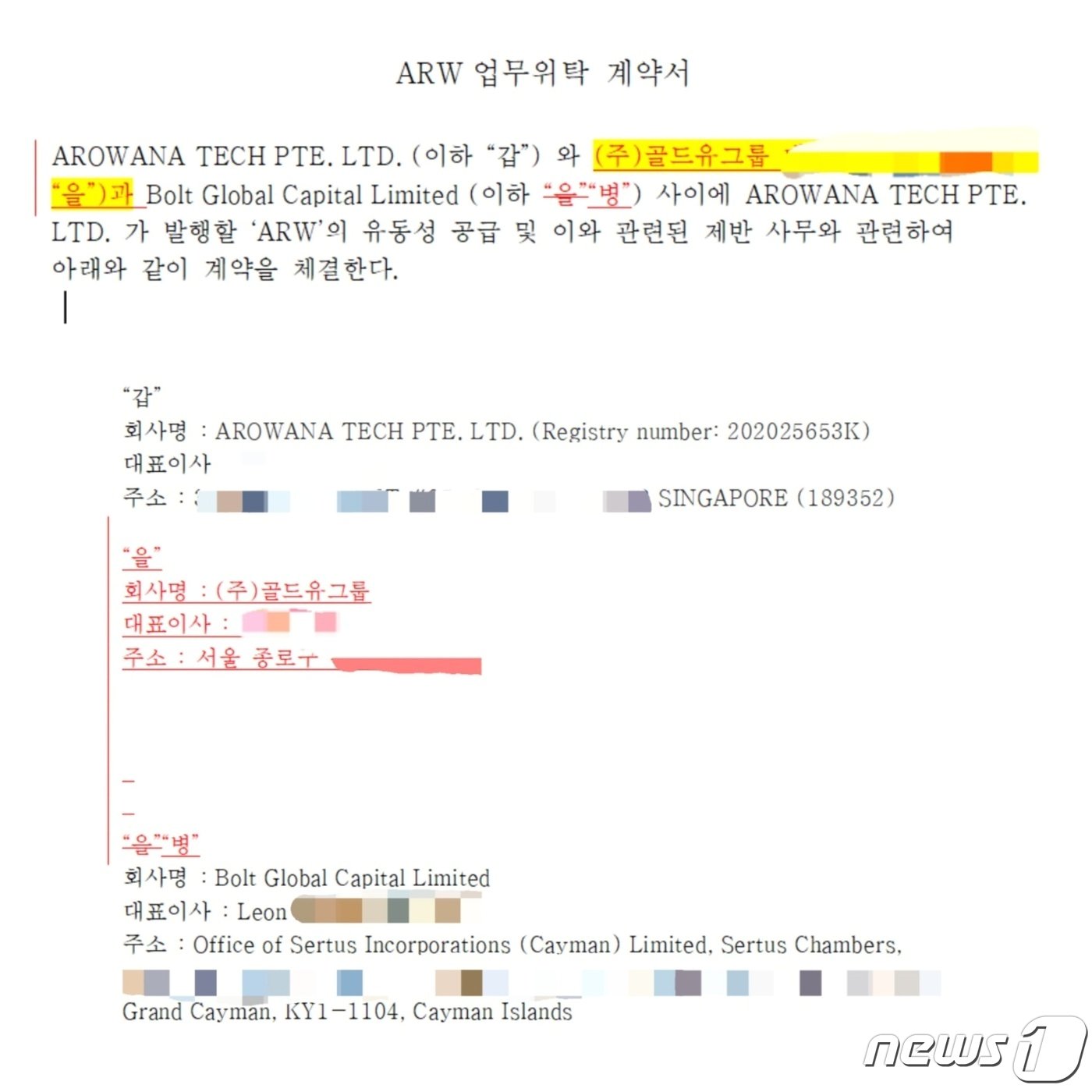 아로와나테크가 투자사 골드유그룹, MM팀 레온(볼트글로벌캐피탈)과 체결한 계약서 초안.