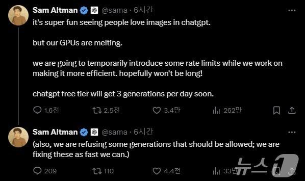 올트먼 CEO "서버과부하 인지, 무료이용자 일일 3개 제한"일부 오류도 수정…"허용된 이미지 생성 불가 문제 해결"샘 올트먼 오픈AI CEO X 갈무리챗GPT 4o 이미지 제네레이션 카툰관련 키워드샘 올트먼GPU폭발인기오픈AI이미지생성혁신프롬프트김민석 기자 "메타로 사명까지 바꿨는데…리얼리티랩스 인력 10% 감축"현신균 LG CNS 사장 "산업현장 지식 기반 피지컬 AI 시장 주도"관련 기사이대로면 AI 데이터센터 35% 못 짓는다…블랙아웃 우려 확산