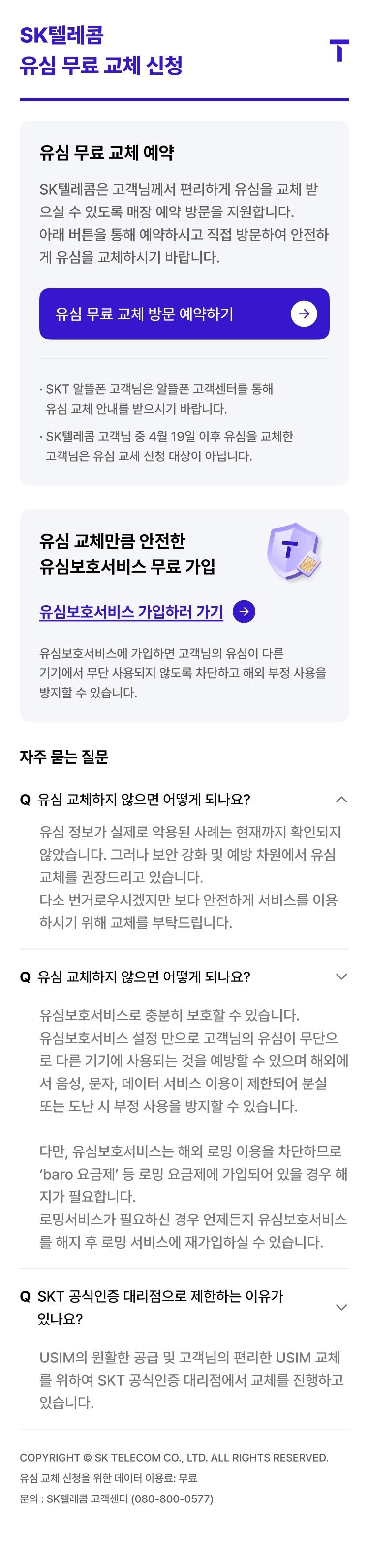 28일 오전 8시30분부터 교체 희망 매장 선택하면 문자 발송대기 화면에서 '유심 보호서비스' 가입도 가능SK텔레콤은 28일 오전 8시 30분부터 '유심 무료 교체 예약 시스템'을 운영한다.(SK텔레콤 제공. 재판매 및 DB금지)2025.4.28/뉴스1관련 키워드SK텔레콤유심해킹교체김민재 기자 아크 레이더스 끌고 기존작 밀고…넥슨, 2연속 '4조 신화' 쓸까넥슨 신작 '아주르 프로밀리아', 코믹월드 330 일산 참가관련 기사이통 3사 영업이익 4.6조원 전망…'해킹 후폭풍'은 진행형위약금 면제 KT, 8일간 가입자 이탈 13만명 넘어공수 바뀐 이통사 가입자 쟁탈전…반복되는 공포마케팅위약금 면제 KT, 이탈 고객 10명 중 7명은 SKT로…이유는?SKT "고객 체감 효과 컸던 보상안은 50% 요금 할인"
