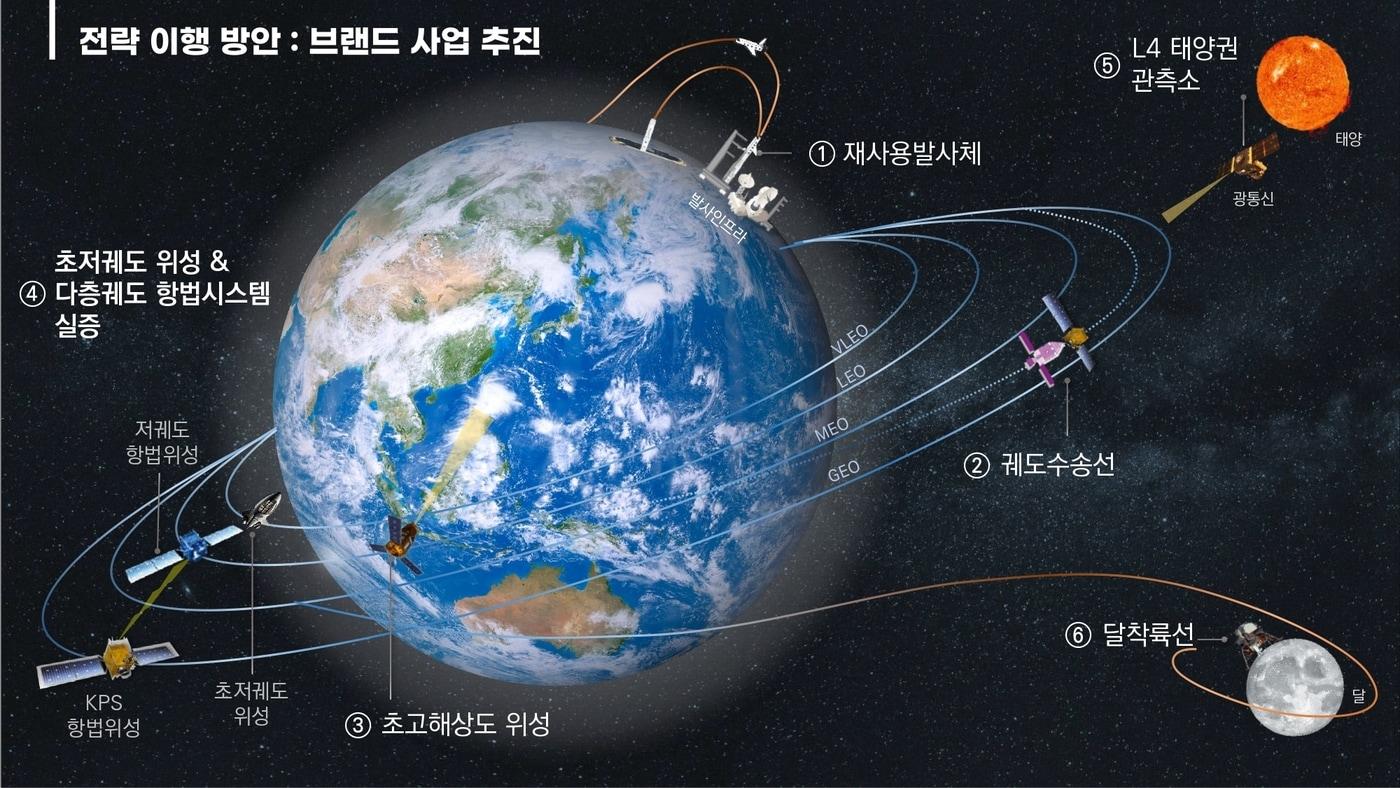 우주청은 특히 브랜드 사업으로 지정한 핵심 과제인 △재사용발사체 및 궤도수송선(우주수송부문) △초고해상도 위성 및 초저궤도위성·다층궤도 항법시스템(인공위성부문) △라그랑주점 L4 태양권 관측소 및 달 착륙선(우주과학탐사부문) 등 사업을 중점으로 전략적 투자를 집중할 계획이다.