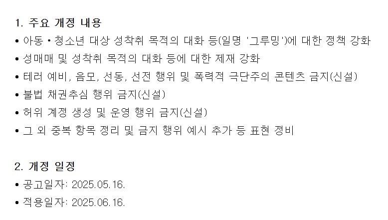 무장 테러조직 찬양·미화 금지 정책, 정치성향 사전검열로 오도신고 후 검토·대화 열람 불가…카카오톡 친구는 아예 제재 못 해6월 16일부터 '폭력적 극단주의 콘텐츠 금지' 조항을 포함한 카카오톡 개정 운영정책이 적용된다. (카카오톡 공지사항 캡처)(카카오톡 공지사항 캡처)관련 키워드카카오카카오톡검열사전 검열극단주의신은빈 기자 크래프톤, 룬샷게임즈에 280억원 투입…1만주 매입한다SOOP, 대전정보문화산업진흥원과 지역 콘텐츠 육성 협력관련 기사극단주의→UN 지정 테러리즘…'검열 시비' 싹 자르는 카카오톡사전 검열 불가능하다는데도…카카오톡 또 때리는 정치권[인터뷰 전문] 서지영 "공수처, 무리한 尹 체포영장 청구로 불신 자초"기술적으로 검열 불가능한 카톡에 '검열 금지법'?카카오, 정부 요청에도 이용자정보 제공 0건…"사전검열 불가능"