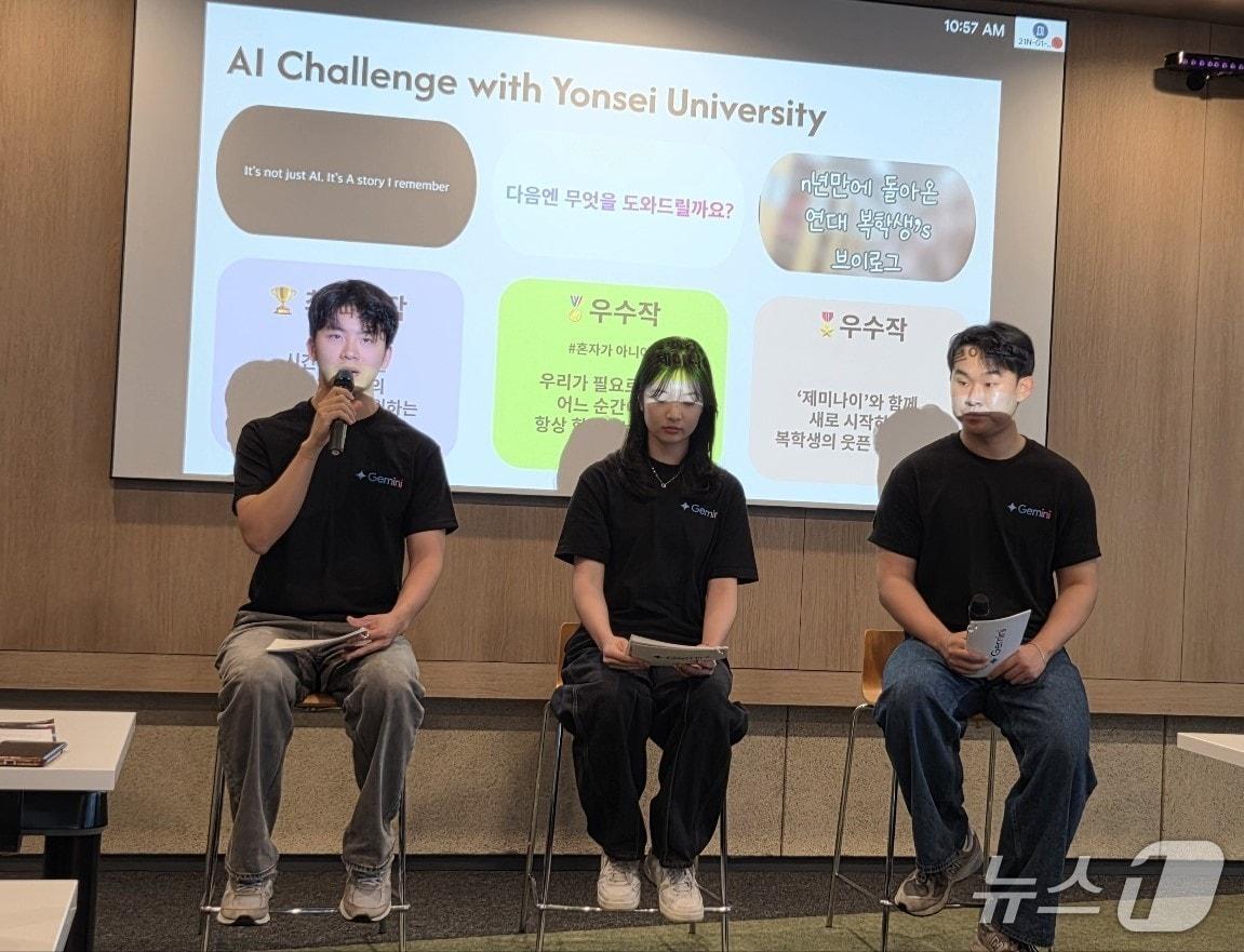 구글 대학생 AI 챌린지…연세대팀 'AI 가족애' 영상 최우수상대학생들 "제미나이로 과제 해결, 친구로도 다가와"왼쪽부터 이노진 연세대 언론홍보영상학부 김은후 연세대 언론홍보영상학부 임도영 연세대 체육교육과 학생들이 서울 역삼동 구글 사무실에서 열린 제미나이 워크숍에서 발표하고 있다. 2025.6.20/뉴스1 ⓒ News1 김민석 기자왼쪽부터 이노진 연세대 언론홍보영상학부 김은후 연세대 언론홍보영상학부 임도영 연세대 체육교육과 학생들이 서울 역삼동 구글 사무실에서 열린 제미나이 워크숍에서 발표하고 있다.(구글코리아 제공)김기환 구글코리아 커뮤니케이션즈 매니저가 서울 역삼동 구글 사무실에서 열린 제미나이 워크숍에서 발표하고 있다.(구글 코리아 제공)관련 키워드연세대대학생챌린지제미나이구글소중한순간.시작점두려움김민석 기자 "벤츠 전용블박 신차 장착"…팅크웨어 '스타뷰프로' 레드닷 수상"품질 논란"…아이폰17, 변색·벌어짐에 셀룰러 속도저하 불만관련 기사'광복 80주년' 감동을 함께…서울 곳곳 뮤지컬·기념행사[서울in]