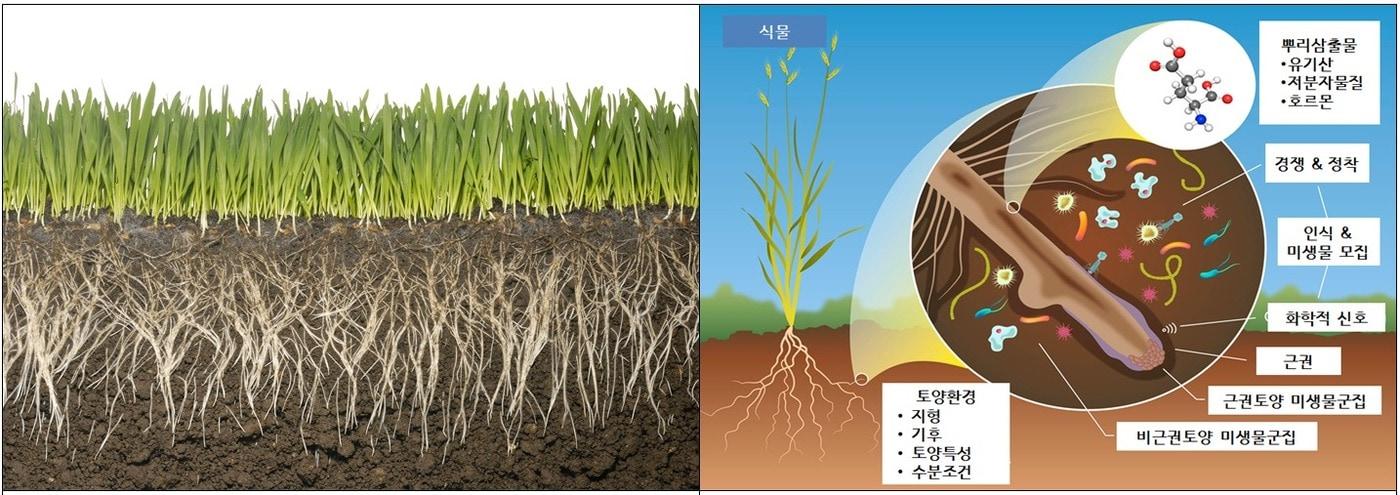 왼쪽부터 뿌리 인근인 '근권'의 모식도와 근권 인근에서 발생하는 미생물 상호작용(농촌진흥청 '함께 사는 미생물, 마이크로바이옴' 보고서 갈무리)