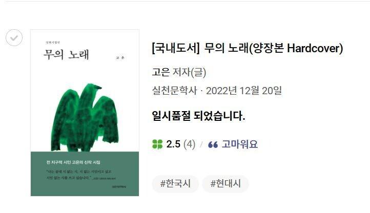 "실천문학사가 공급 중단 공식적으로 알리지 않아"고은 시집 '무의 노래' 검색 결과(출처: 교보문고 온라인 서점)관련 키워드무의노래교보문고.고은알라딘예스24김정한 기자 "주류로 진화하는 '포스트 서브컬처'"…'울트라백화점 서울' 시즌 2조계종 총무원장 진우스님 "AI 시대, 'K선명상'으로 국민 평안 이끌 것"…신년사