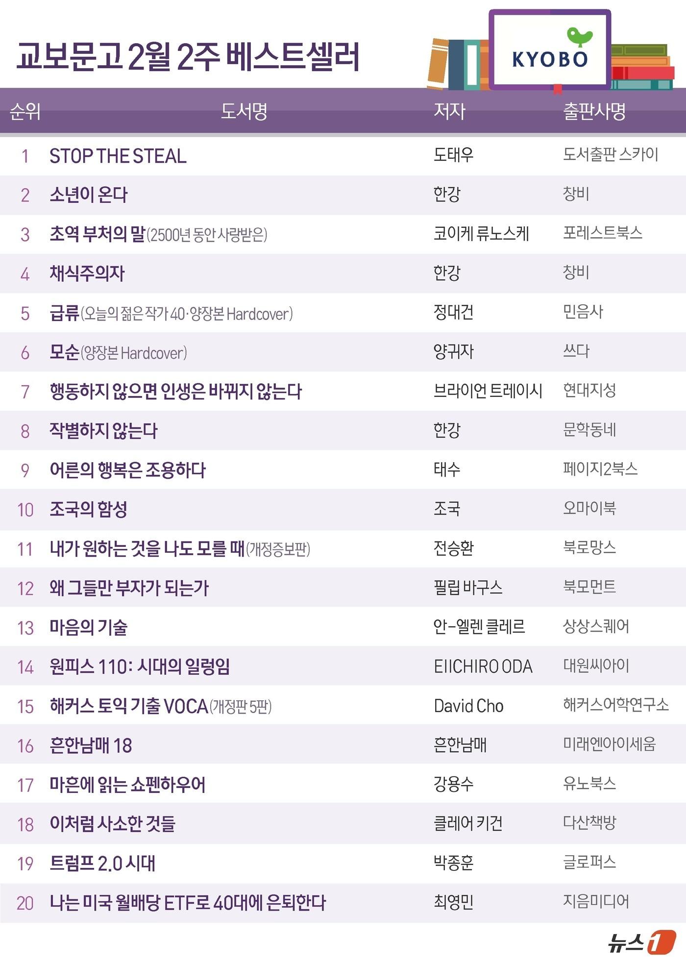 14주 연속 정상 올랐던 한강 '소년이 온다', 이번엔 2위로교보문고 2월 2주 베스트셀러ⓒ News1 김초희 디자이너관련 키워드교보문고주간베스트셀러스톱더스틸김정한 기자 교황청, 로마 귀환…70년 '아비뇽 유수' 종식 [김정한의 역사&오늘]국립현대미술관, 정재승 교수 초청 '뇌과학과 예술' 강연 개최