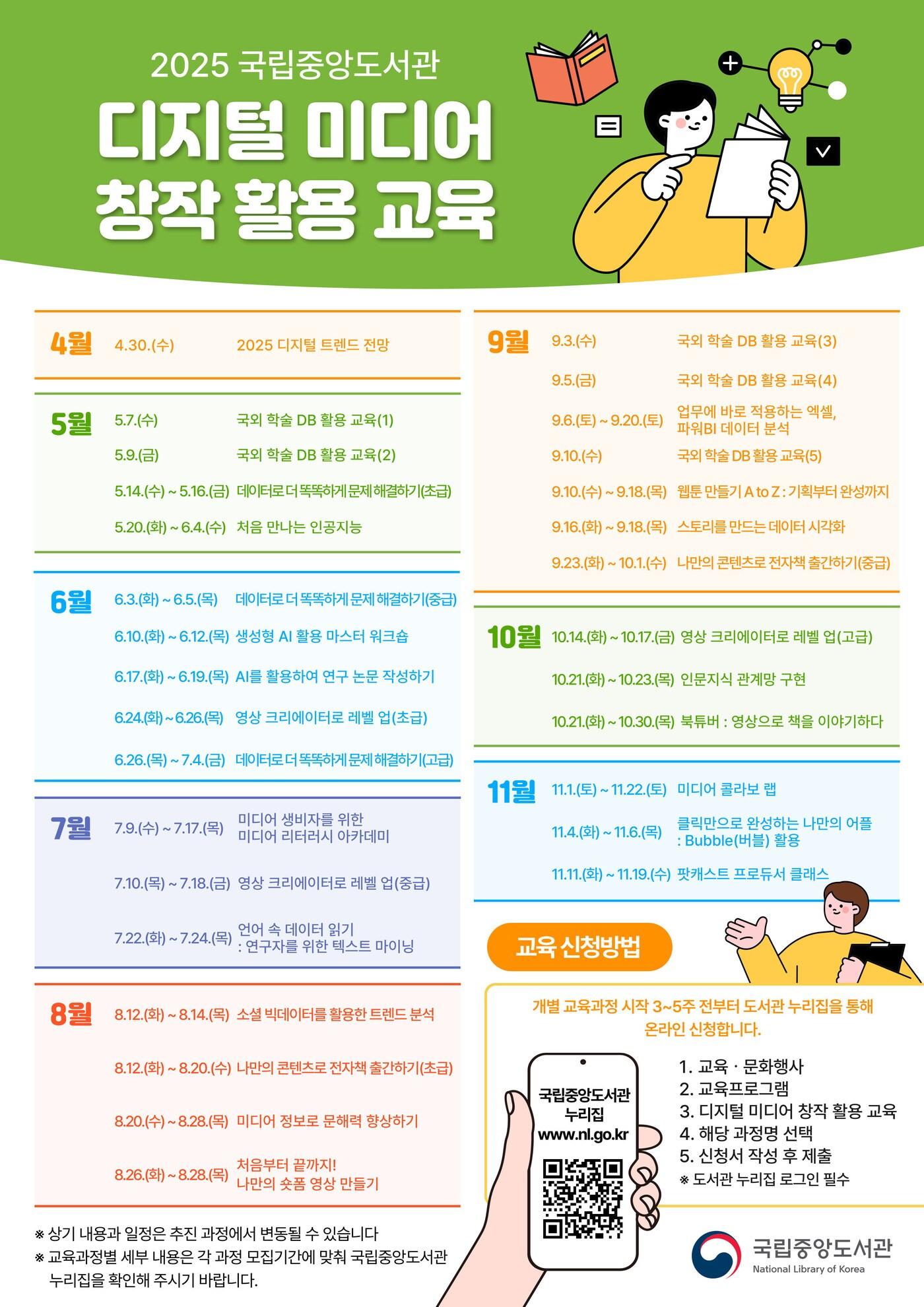 '2025년 디지털 미디어 창작 활용 교육' 연중 운영 각 과정별 교육 시작 3~5주 전 모집 공고'2025년 디지털 미디어 창작 활용 교육' 포스터 (국립중앙도서관 제공)관련 키워드국립중앙도서관디지털미디어창작활용교육김정한 기자 국립현대미술관, 정재승 교수 초청 '뇌과학과 예술' 강연 개최박수근·쿠사마 야요이 등 '50억 규모' 출품…서울옥션, 1월 경매