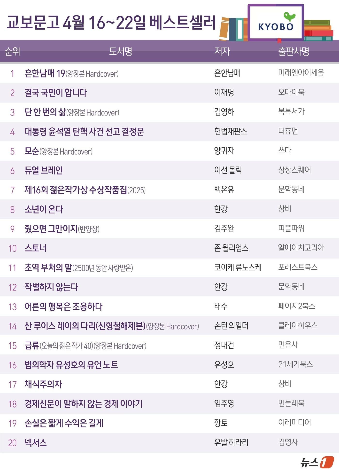 '결국 국민이 합니다' 2위…'단 한 번의 삶' 3위교보문고 최신 주간 베스트셀러(4월 16~22일)ⓒ News1 윤주희 디자이너관련 키워드교보문고주간베스트셀러흔한남매19김정한 기자 국내 신문산업 매출, 사상 첫 5조 돌파…인터넷신문 주도 속 '양극화' 심화"주민 92.9% 지지율의 비결"…일잘러 '성동구청장'의 행정 기록관련 기사한강 '빛과 실', 출간 즉시 1위…노벨상 이후 첫 신작에 관심 집중