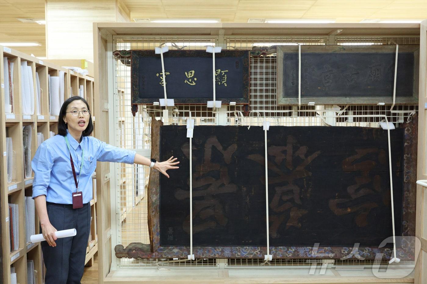 5일 오후 서울 종로구 국립고궁박물관에서 직원이 수장고에 보관된 경모궁 현판을 공개하고 있다. 조선왕실 전문 박물관인 국립고궁박물관은 8만8000여 점의 왕실 유물을 보유하고 있으며 이 유물들은 재질에 따라 적정 온·습도가 유지되는 19개 수장고에 보관되어 있다. 2024.6.5/뉴스1 ⓒ News1 신웅수 기자
