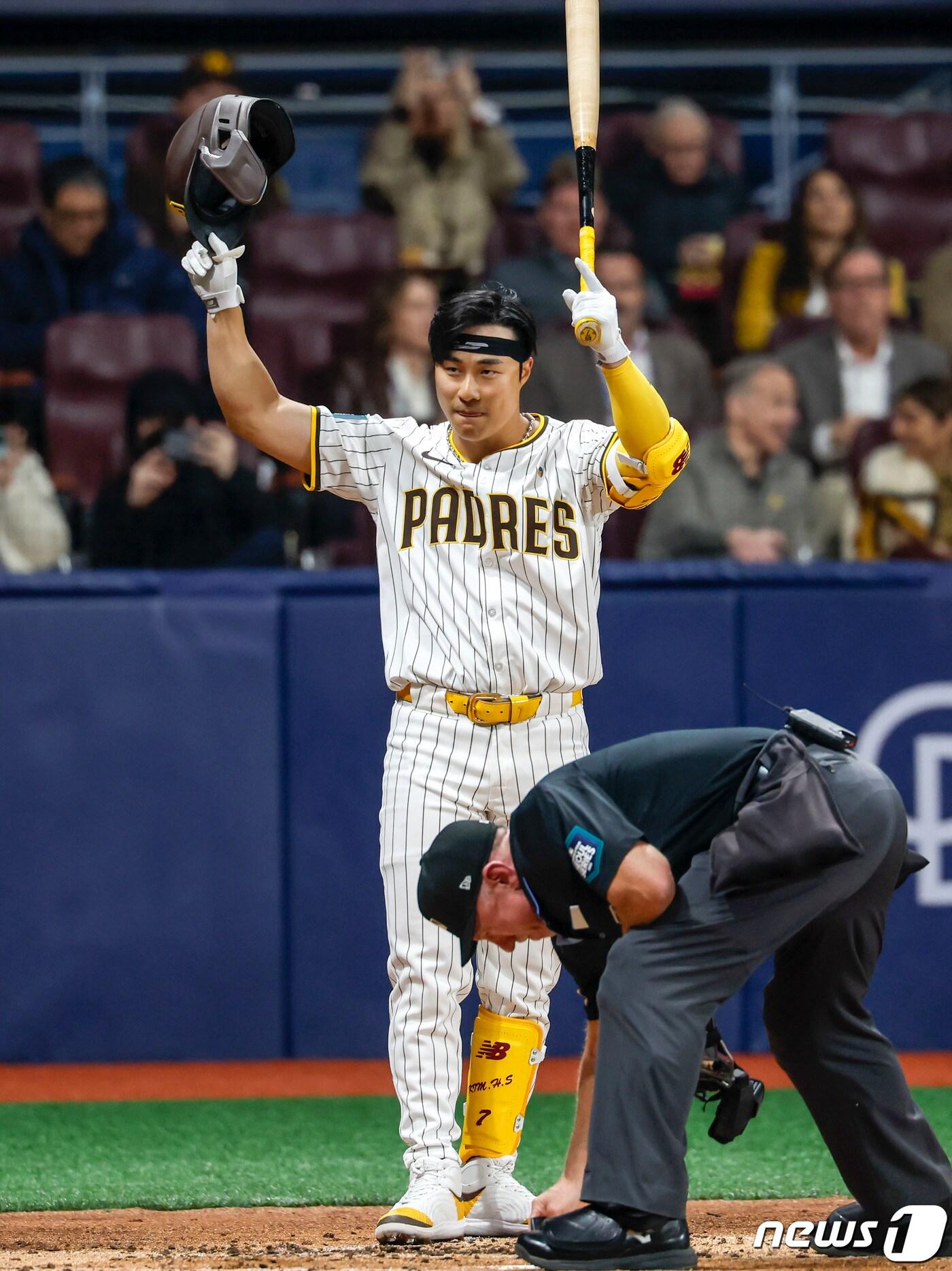 20일 오후 서울 고척스카이돔에서 미국프로야구(MLB) 공식 개막전 LA다저스 대 샌디에이고 파드리스 1차전 경기, 2회말 1사 주자없는 상황 타석에 들어선 샌디에이고 김하성이 관중들에게 인사를 하고 있다. (공동취재) 2024.3.20/뉴스1 ⓒ News1 박정호 기자