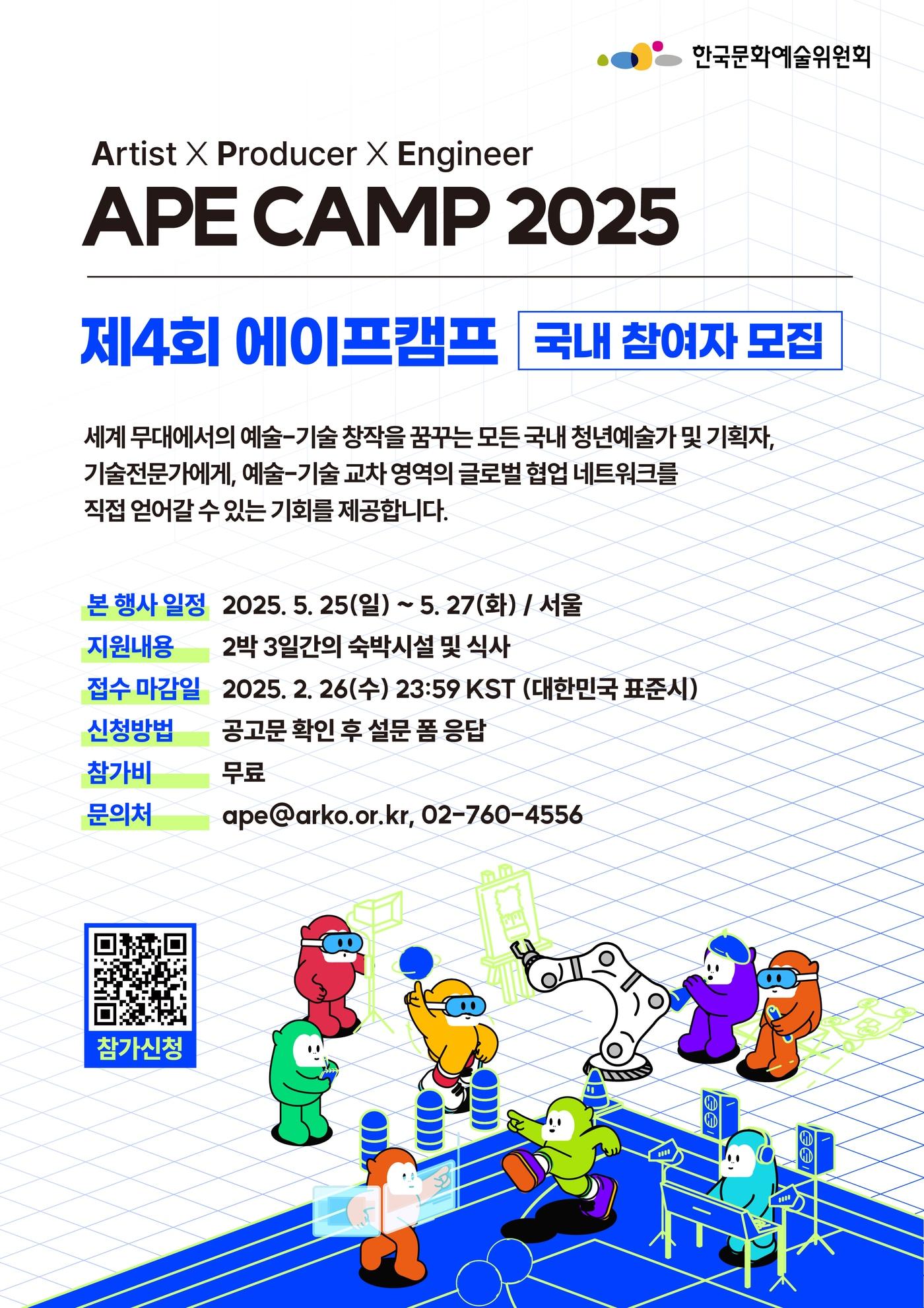 오는 26일까지 모집…캠프는 5월 25~27일 열려'제4회 에이프캠프' 공고 포스터(한국문화예술위원회 제공)관련 키워드에이프캠프한국문화예술위원회예술위원회정수영 기자 '英 자존심' BBC 심포니, 13년 만의 내한…손열음과 전국투어"산불에 국가유산 잃어선 안 돼"…최휘영, 신속한 '초동 대응' 주문관련 기사"예술계도 AI시대 준비해야"…아르코 '예술잡多' 라운드테이블 개최AI·NFT·키네틱아트의 미래 찾다…에이프캠프x국제컨퍼런스 '성료'문화예술세계총회 등 개최…정병국 "아르코국제주간으로 글로벌 거점 마련"