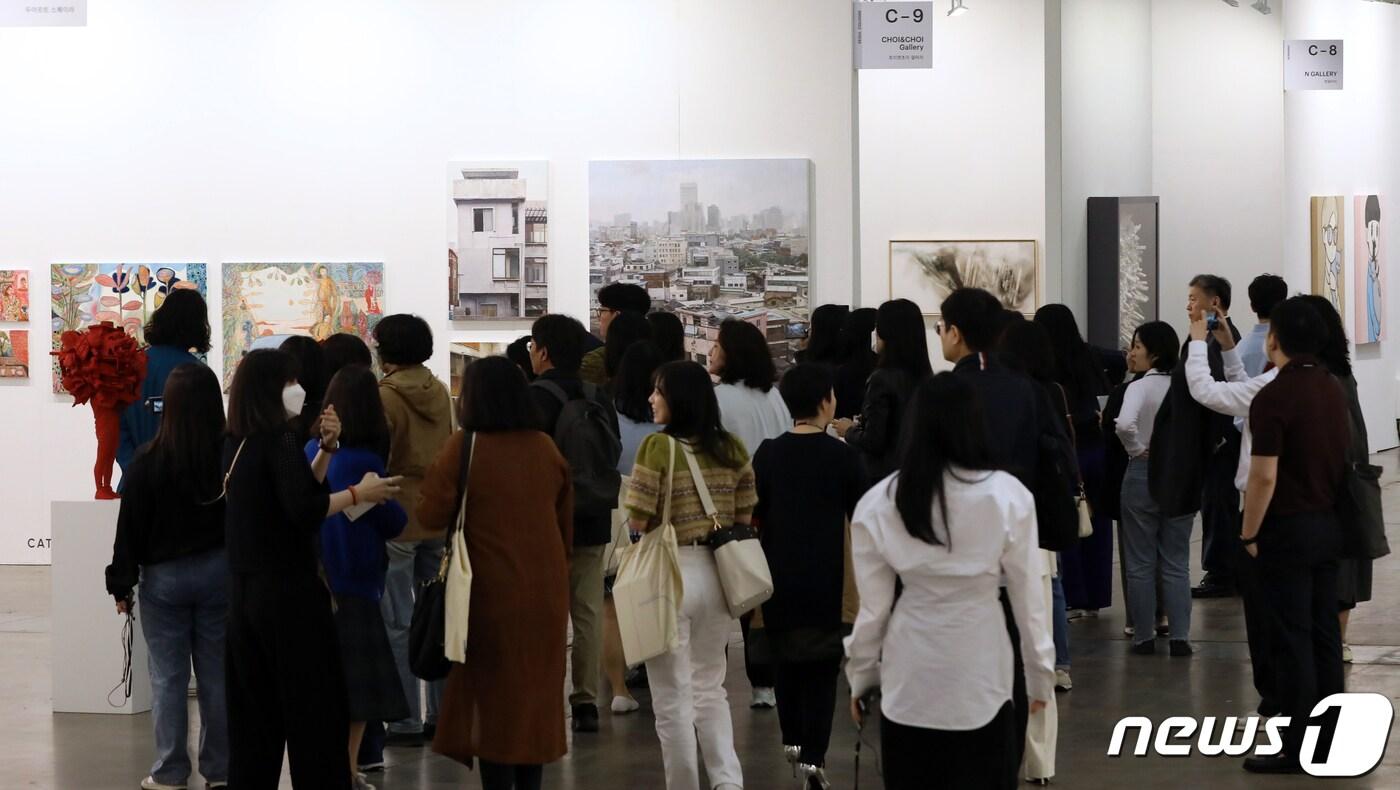 4일 부산 해운대구 벡스코에서 열린 '아트부산 2023' 프레스투어(사전 공개)에서 참석자들이 작품을 둘러보고 있다. 이날 사전 공개를 시작으로 오는 5일부터 7일까지 열리는 이번 행사에는 22개국 145개 갤러리(국내 111개·해외 34개)가 참여해 역대 최대 규모로 치러진다. 2023.5.4/뉴스1 ⓒ News1 윤일지 기자