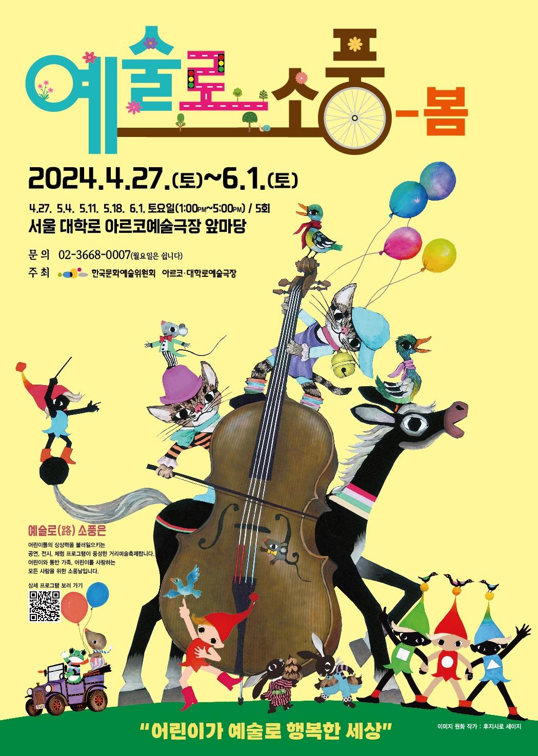 서울 대학로 아르코예술극장 앞마당 4월 27일~5월 18일, 6월 1일전남 나주시 서성문 앞 잔디마당 5월 25일'예술로(路)소풍-봄' 축제 포스터(한국문화예술위원회 제)관련 키워드한국문화예술위원회예술로(路)소풍봄서울나주정병국아르코대학로예술극장김정한 기자 국립현대미술관, 정재승 교수 초청 '뇌과학과 예술' 강연 개최박수근·쿠사마 야요이 등 '50억 규모' 출품…서울옥션, 1월 경매