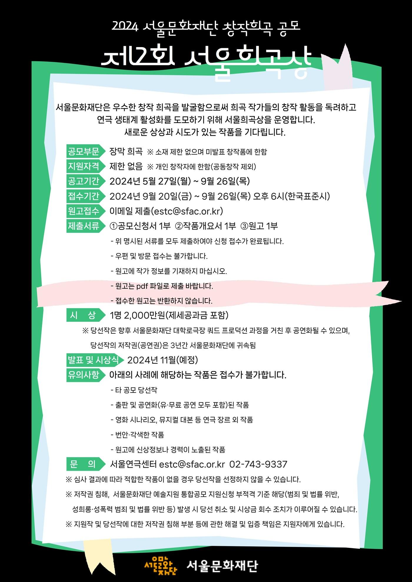 응모 기간 9월 20~26일'제2회 서울희곡상' 공포 포스터(서울문화재단 제공)관련 키워드제2회서울희곡상서울문화재단창작희곡김정한 기자 [인사] 한국학중앙연구원한국고전번역원, '교육기부 진로체험 인증기관' 재선정…3년간 자격 유지관련 기사265대 1 뚫고…김유경 작가, 제3회 서울희곡상 수상"새로운 이야기 찾습니다"…상금 3천만원 '제3회 서울희곡상' 공모