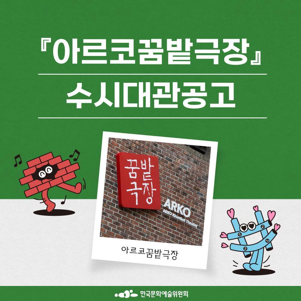 접수 기간 8월 28일~9월 10일2024년 아르코꿈밭극장 수시대관 공모(한국문화예술위원회 제공)관련 키워드한국문화예술위원회정병국아르코대학로예술극장아르코꿈밭극장.수시대관공모김정한 기자 "주류로 진화하는 '포스트 서브컬처'"…'울트라백화점 서울' 시즌 2조계종 총무원장 진우스님 "AI 시대, 'K선명상'으로 국민 평안 이끌 것"…신년사관련 기사"예술 현장 목소리, 정책이 된다"…아르코, 온라인 소통 창구 개설국내 문화예술 활동 6만 건 돌파…창작초연 강세신구·손열음부터 최호종까지…기초예술계로 번지는 기부 릴레이아르코, 문화예술로 ESG 실천…나주시와 지역 상생 논의"'문화누리카드' 잔액 확인하셨나요? 31일까지 꼭 사용하세요"
