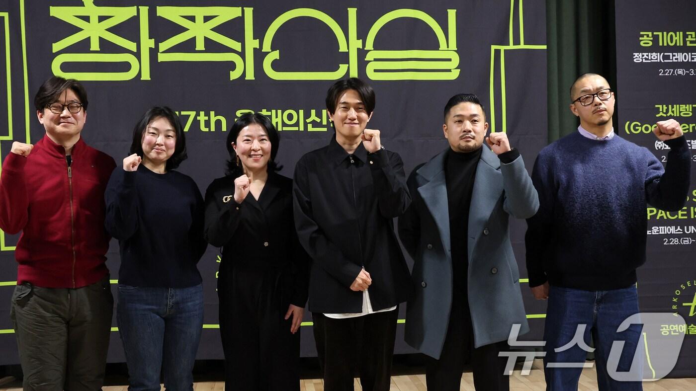 18일 오후 서울 종로구 예술가의집에서 열린 '17회 공연예술창작산실 올해의신작' 5차 시기별 기자간담회에서 공연 관계자들이 기념촬영을 하고 있다. 지난 2008년부터 시작된 공연예술창작산실은 연극, 창작뮤지컬, 무용, 음악, 창작오페라, 전통예술 등 기초 공연예술 분야의 특성을 살린 단계별 지원을 통해 장르별 우수 창작 작품을 발굴하는 한국문화예술위원회의 지원사업이다. 패러디와 다큐멘터리, 옴니버스 등 다양한 형식으로 창작한 실험 무대로 가득한 6개 공연은 오는 21일부터 막을 올린다. 2025.2.18/뉴스1 ⓒ News1 오대일 기자