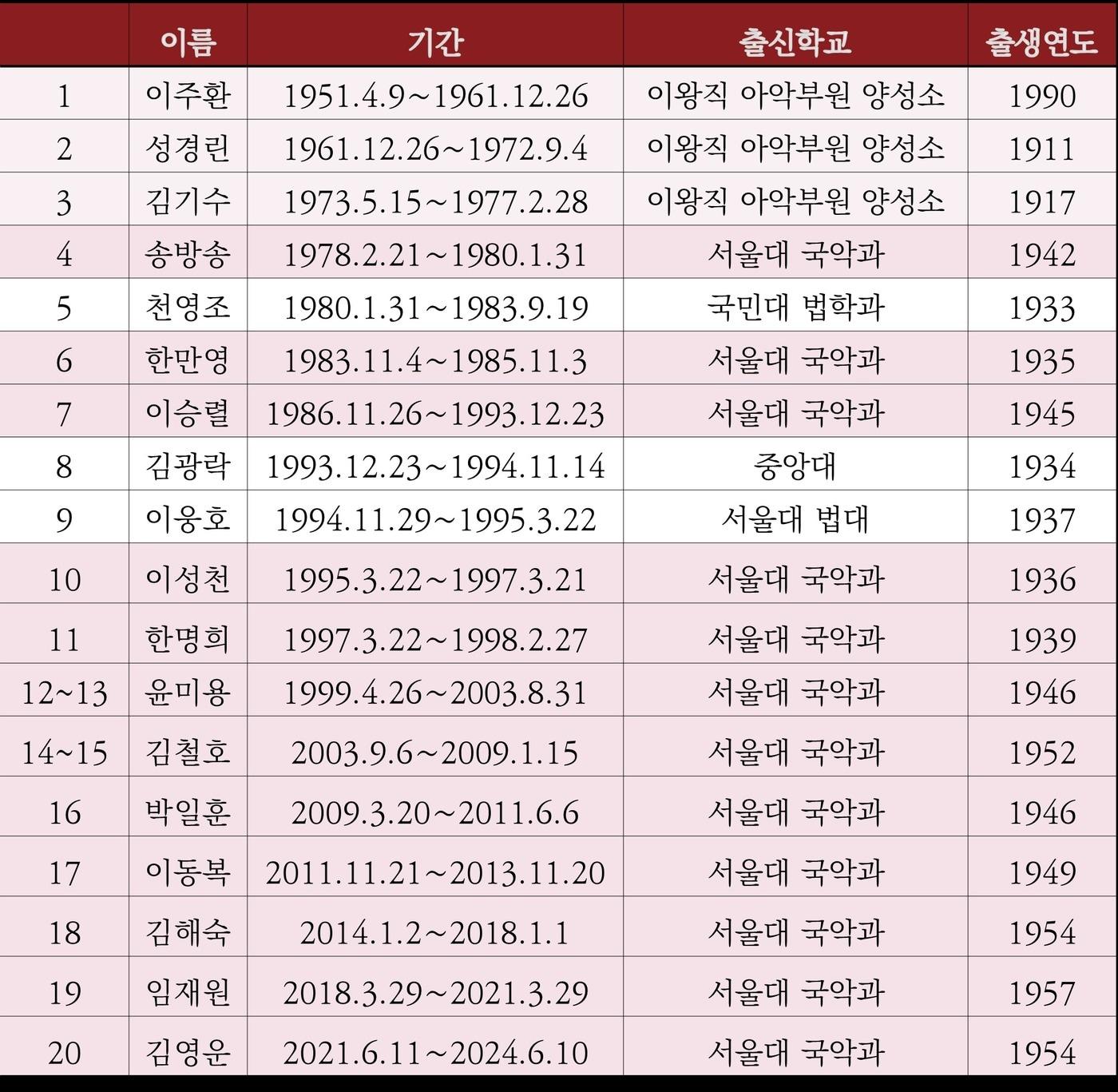 서울대 국악과 학번순으로 30년간 국립국악원장직 독식국립국악원장 역대 현황(출처 국립국악원)유인촌 문화체육관광부 장관이 21일 경기 가평군 캐나다전투기념비 앞에서 열린 가평 전투 소재 한국·캐나다 공동 창작뮤지컬 ‘링크(R:LINK)’ 제작발표회에서 격려사를 하고 있다. (문화체육관광부 제공. 재판매 및 DB 금지) 2025.3.21/뉴스1관련 키워드국립국악원장유인촌박정환 문화전문기자 [팀장칼럼] 李대통령 '뮷즈 칭찬' 다음날…제보자가 보낸 문자종교계 "세계청년대회 특별법은 종교갈등의 씨앗"관련 기사유인촌 장관 "국립국악원장 관련, 다수가 공감할 방안 찾겠다"유인촌, 국악원장 내정설 일축…"결정한 사안이 아니다"[기자의 눈] "고질적 관행 끊어내자"…국립국악원장 임명시 선결 과제는