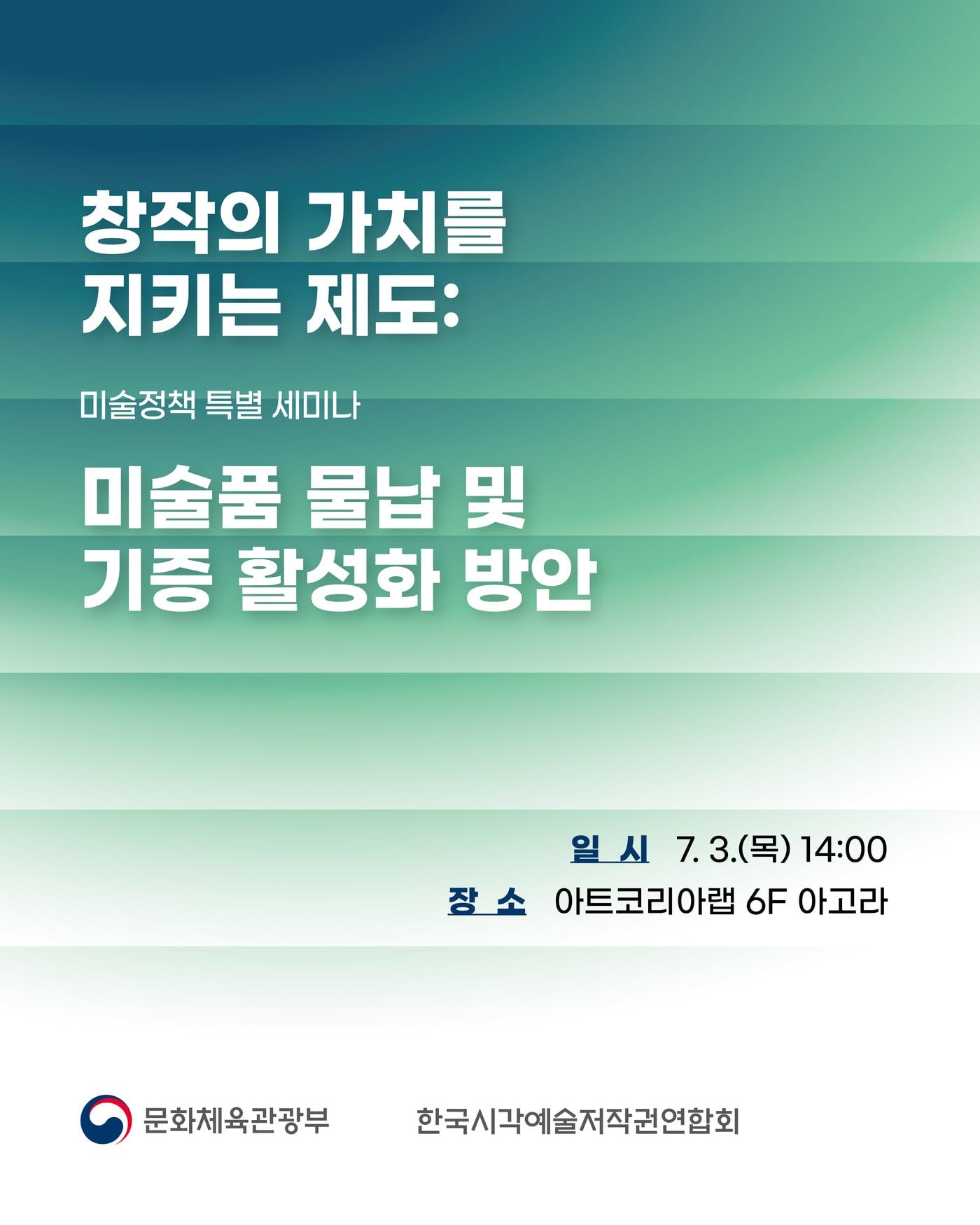 미술 정책 특별 세미나관련 키워드문화체육관광부장관유인촌한국시각예술저작권연합회미술품물납활성화미술정책특별세미나박정환 문화전문기자 "정원오가 잘하기는 잘하나 봅니다"…李대통령 한마디에 판이 들썩했다정권 교체 후 대대적 전환…박진영·은희경 위원장까지 [2025 총결산-문화정책]관련 기사전업작가·미술관계자 맞춤형 저작권 교육 실시