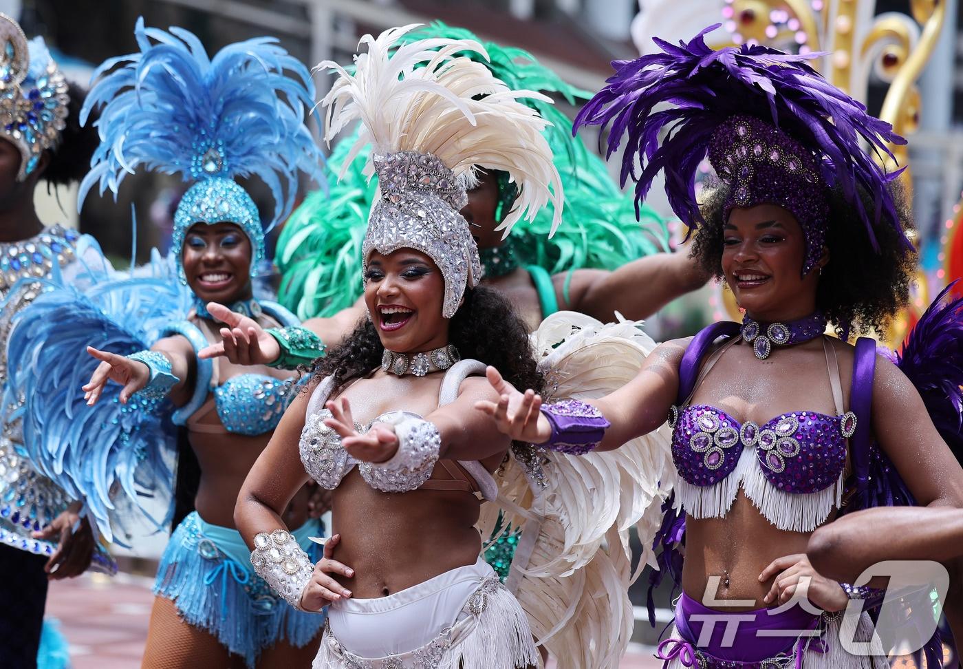 9일 서울 송파구 롯데월드 어드벤처에서 연기자들이 '삼바 카니발 퍼레이드' 공연을 펼치고 있다. '삼바 카니발 퍼레이드'는 롯데월드 어드벤처 1층 퍼레이드 코스에서 매일 오후 2시와 8시 두 차례 진행된다. 또 다양한 춤을 즐길 수 있는 ‘삼바 투게더’는 매일 오후 6시 30분 가든스테이지에서, 삼바를 직접 배워보는 ‘삼바 스태프 스쿨’은 주중 오후 3시 30분 만남의 광장에서 진행된다. 2025.7.9/뉴스1 ⓒ News1 박지혜 기자
