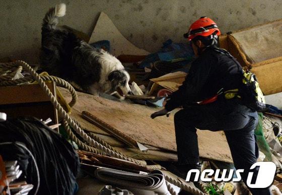 22일 오전 광진구 능동 어린이회관에서 열린 한국애견협회 인명구조견 테스트에서 앤디(보더 콜리)가 후각을 이용한 인명 구조 테스트를 하고 있다. 산사태나 건물 붕괴 등 인명 구조가 필요한 상황에서 실종자 수색을 맡는 인명구조견은 뛰어난 후각과 청각 능력으로 수색대원 50명 이상의 역할을 한다. 2015.4.22/뉴스1 ⓒ News1 신웅수 기자