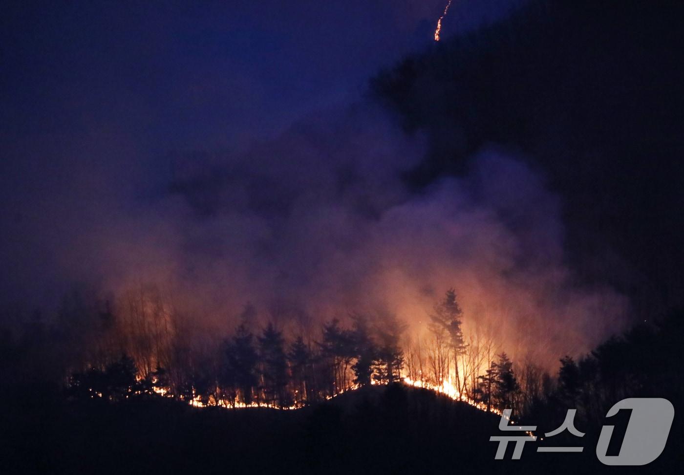 경남 산청·하동 산불 일주일째인 27일 오후 지리산과 인접한 산청군 시천면 동당마을 일대에 산불이 확산하고 있다. 2025.3.27/뉴스1 ⓒ News1 윤일지 기자