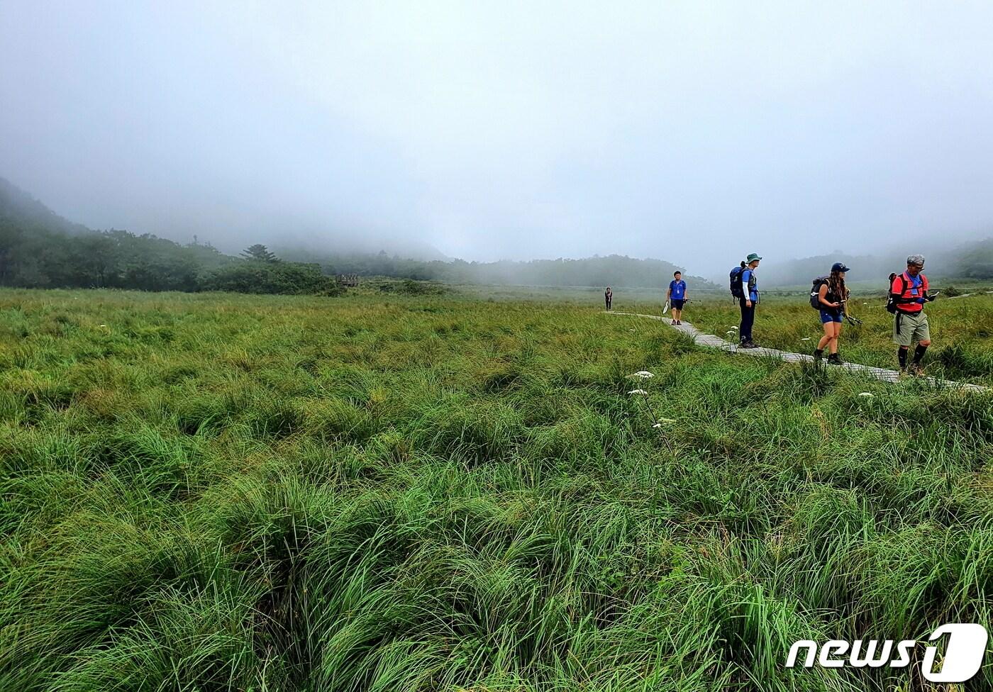용늪 트레킹. 해발 1280m의 고지에 이렇게 푸르른 초원이 있다니! 안개 자욱한 습지 풀밭에서 이색적인 풍경을 즐기는 사람들