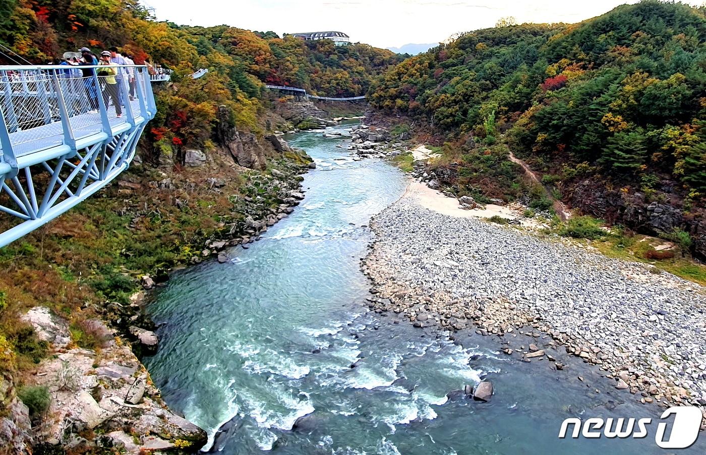 ⓒ News1 윤주희 디자이너재인폭포의 가을. 매년 0.76mm씩 뒤로 물러서서, 현재는 한탄강과 380m 떨어져 있다. 사진 연천군 홈페이지.재인폭포 절벽 디테일. 사진을 확대해 보면 왼쪽 상부에 수평절리, 왼쪽 하부에 동굴, 가운데에 수직절리(주상절리) 등의 다양한 지질현상을 관찰할 수 있다.비둘기낭 폭포. 숲속에 감추어진 비밀의 폭포에 초록 물이 가득 담긴 물웅덩이와 커다란 동굴.하늘다리와 한탄강. 지상에서 50m 높이의 다리에서 짜릿한 고도감을 느끼며 한탄강을 바라본다. 바닥에 설치된 유리를 걸으면 더욱 아찔하다.하늘다리에서 바라본 한탄강 상류. 왼쪽에 현무암의 주상절리가 깊게 패여 절벽을 이루고 있다. 아래에 힘차게 흘러가는 여울의 힘이 깊은 협곡을 만들었다.화적연. 왼쪽은 겸재 정선이 그린 화적연. 오른쪽은 현재의 화적연. 겸재의 그림은 풍경의 특징을 강조해서 바위가 더 높고, 절벽이 더 웅장해 보인다. 그림 한탄강세계지질공원 홈페이지.한탄강 풍경. 큰 여울(漢灘)에서 물보라를 일으키며 흘러가는 한탄강. 왼쪽의 현무암 절벽에 설치된 3.6km의 잔도로 사람들이 걷고 있다.한탄강 현무암. 용암이 식어 현무암이 된 당시에는 절벽 위 숲에 가느다란 물이 흘렀을 것이다. 그 물이 오랜 세월동안 현무암을 깎아내 오늘의 깊은 협곡이 되었다. 사진을 확대하면 세로로 갈라지는 주상절리 모습이 확연하다.잔도의 스카이웨이 전망대. 절벽에서 허공으로 설치된 다리에서 보는 전망이 시원하고 아찔하지만, 인공시설이 과하다는 느낌도 든다.잔도의 북쪽에서 유유히 굽이치며 흘러가는 한탄강. 발원지인 북한의 평강군에서 136km의 협곡을 흘러 연천에서 임진강에 합류된다.철원 평야. 용암으로 덮여 평편해진 용암대지(臺地). 밥맛 좋기로 유명한 철원오대쌀이 이곳에서 생산된다. 사진 철원군 홈페이지.