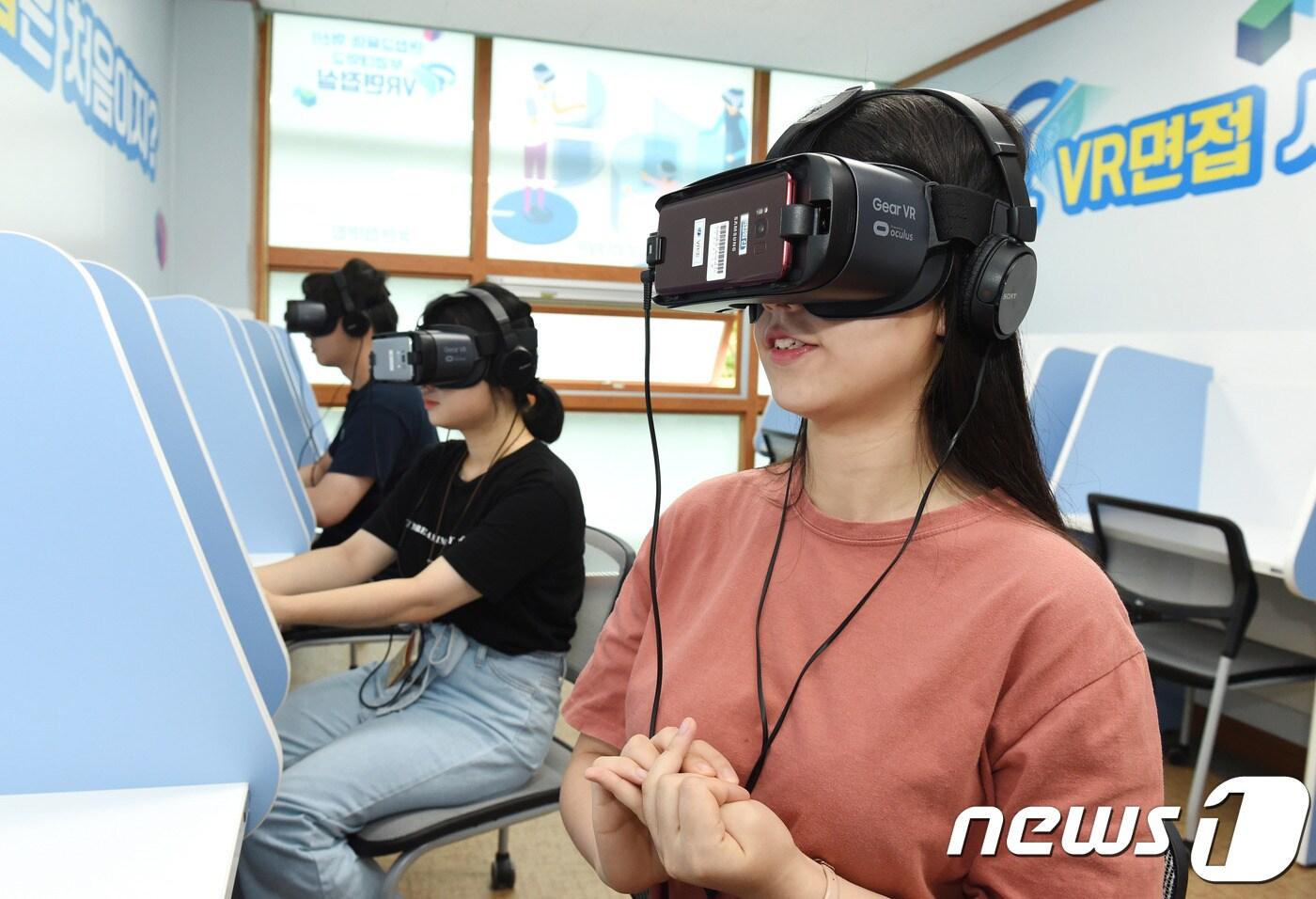 부경대 VR 전용 면접실에서 학생들이 VR 기기를 착용하고 가상 면접을 진행하고 있다.(부경대 제공)ⓒ 뉴스1