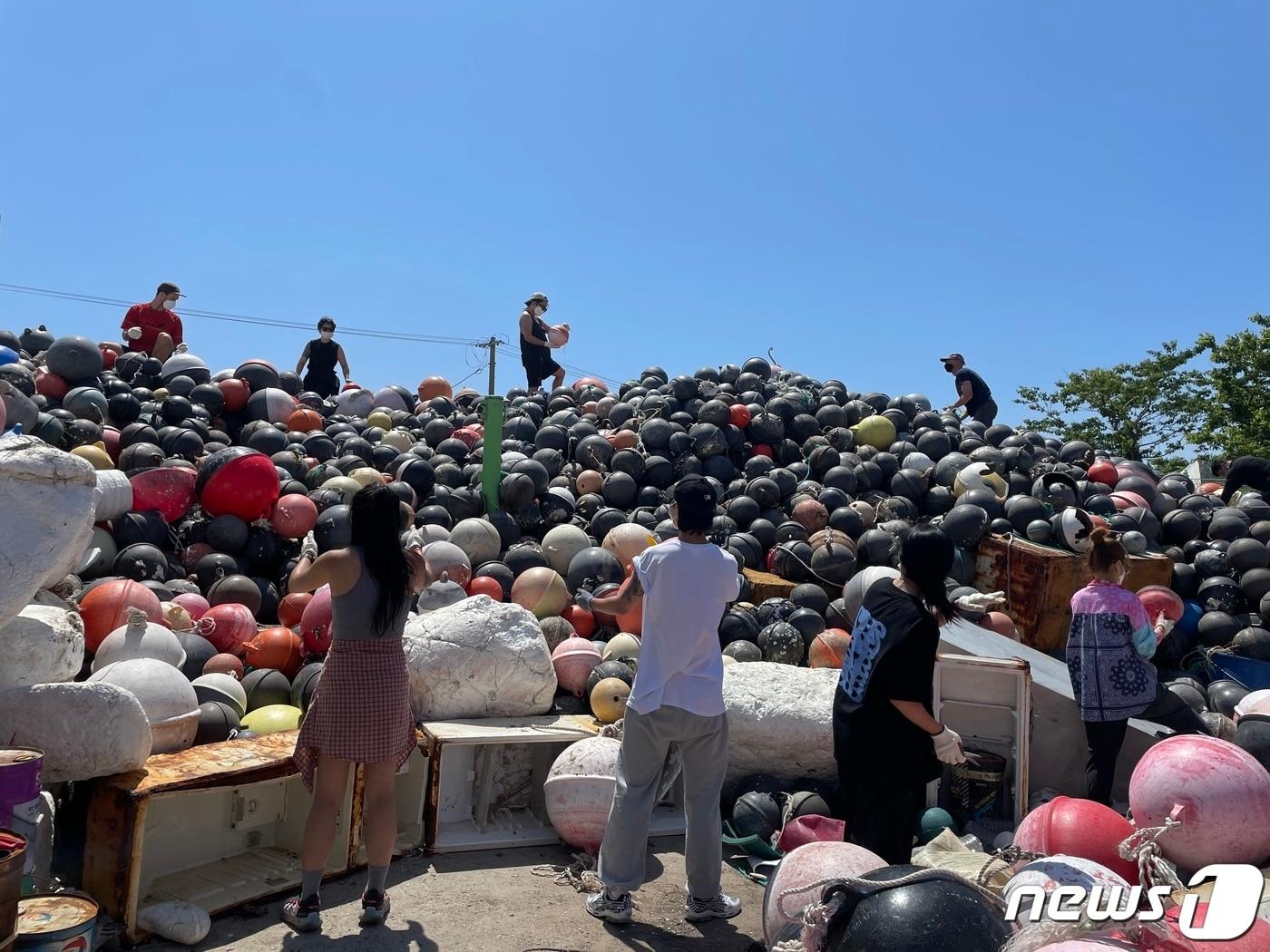 세이브제주바다 활동가들이 제주도 바다에서 수거한 부표를 집하장에 모으고 있다.(한주영 세이브제주바다 대표 제공)ⓒ 뉴스1