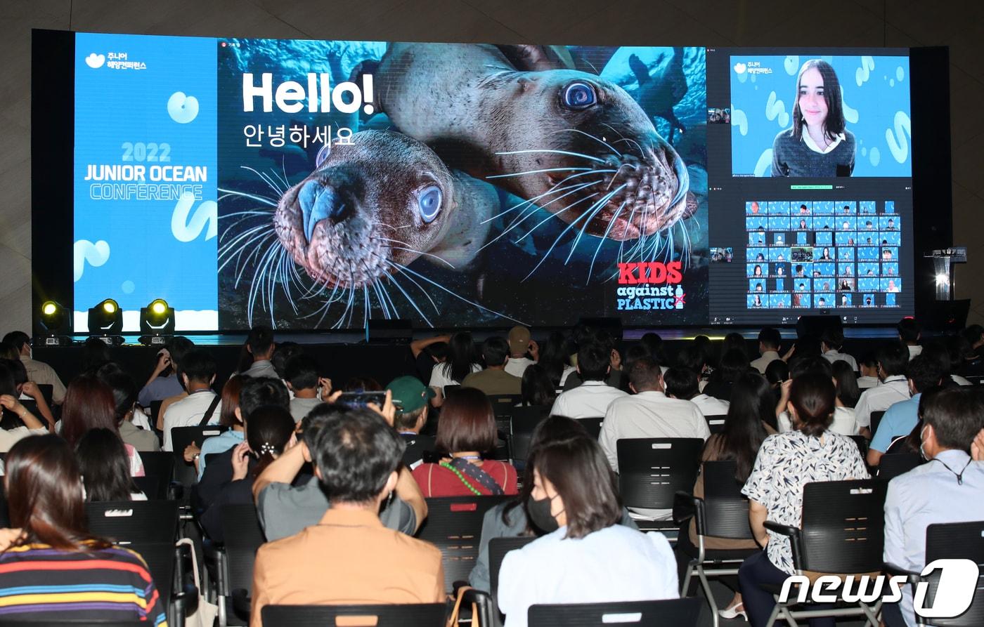 29일 부산 동구 부산항국제전시컨벤션센터 콘퍼런스홀에서 열린 '2022 주니어해양콘퍼런스'에서 타일러 러쉬 주니어해양콘퍼런스 홍보대사가 온라인으로 기조연설을 하고 있다. 2022.7.29/뉴스1 ⓒ News1 김영훈 기자