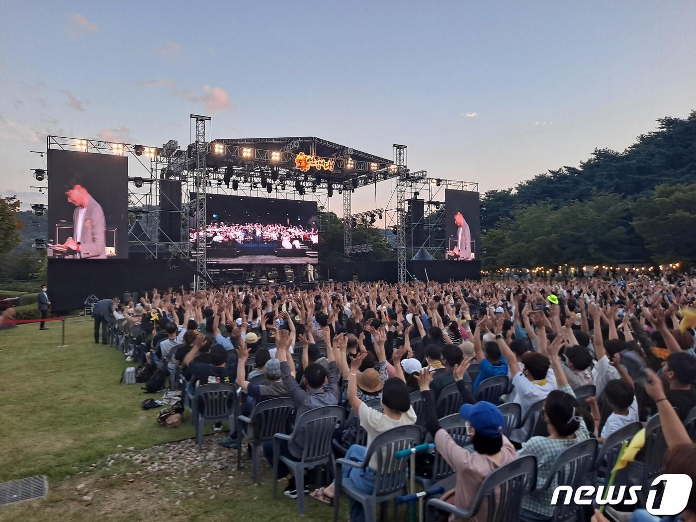 김제동·알리·육중완 등 무대 올라…권양숙·정세균·김두관 등 참석9월1일 정식개관 앞둔 '깨어있는시민 문화체험전시관'도 특별 개방제13회 봉하음악회가 27일 오후 경남 김해시 진영읍 봉하마을 잔디동산 특설무대에서 열리고 있다. 2022.08.27 김명규 기자27일 개최된 제13회 봉하음악회에서 방송인 김제동씨가 토크콘서트를 진행하고 있다. 2022.08.27 김명규 기자27일 열린 봉하음악회에서 무대 화면 가운데 비친 권양숙 여사가 밝게 웃고 있다. 2022.08.27 김명규 기자