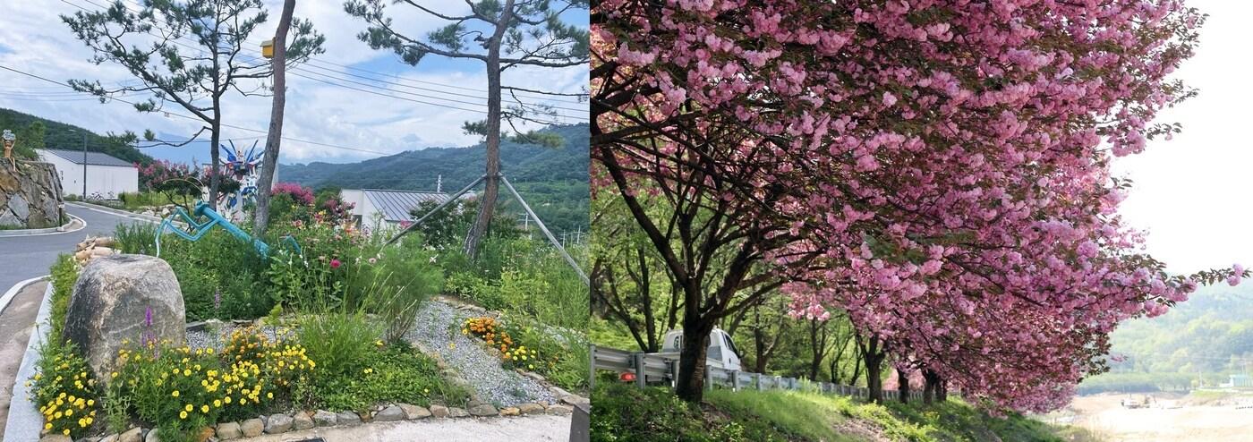 극단 큰들 산청마당극마을 꽃동네(왼쪽)와 산청군 오부면 지방도 1026호 도로변 벚나무(산청군 제공)