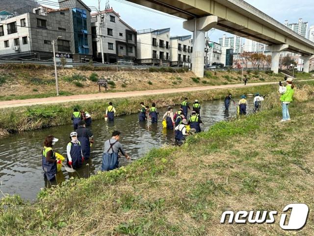 유해물질 '시안' 배출허용 기준보다 320배 초과시 "환경오염 범죄 무관용 원칙으로 강력 처분할 것"…업체 고발11월19일 경남 해반천에서 4~5cm 크기의 피라미 등 물고기 수만 마리가 집단 폐사해 시가 수거를 하고 있다. (김해시 제공)